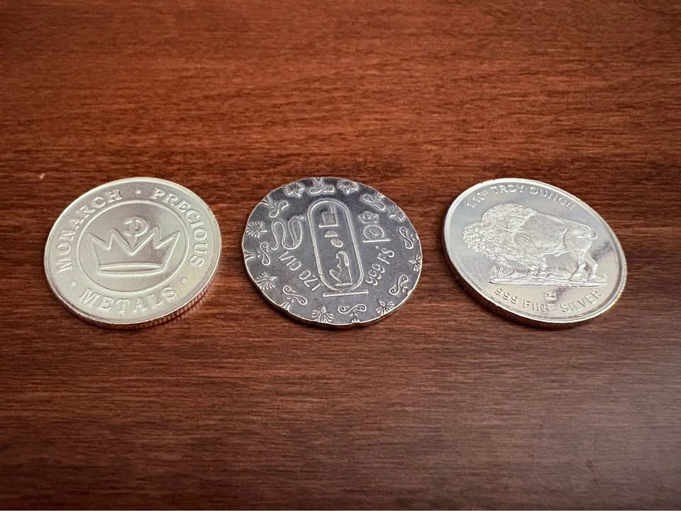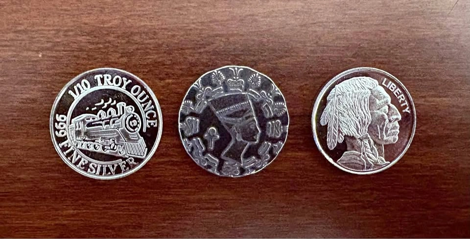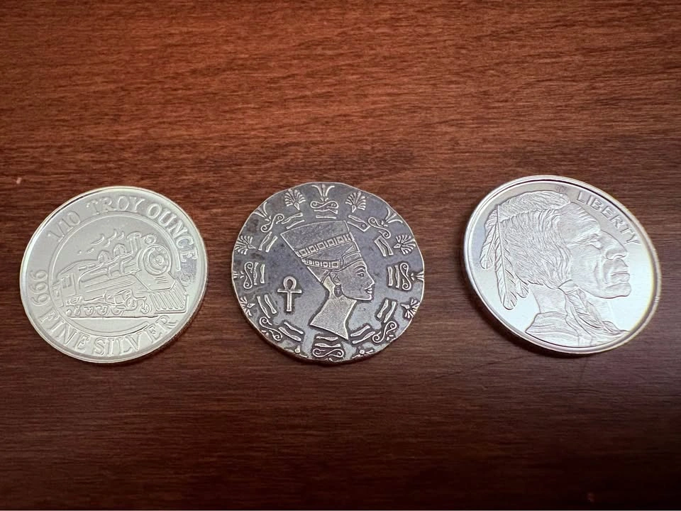 653 X 1/10th oz .999 pure silver rounds. From left to right Monarch Precious Metals Train, Monarch Precious Metals Queen Nefertiti old world style round, Monarch Precious Metals Buffalo/Indian head. The Nefertiti round looks different as it has been purposely made to look "old" in homage to ancient coinage of the past. No two rounds are exactly alike as they have been purposely hand struck off center and given an application of “antique" patina along with an "anti-polish" to add to the look of old world charm. Great original and meaningful gift idea that will only increase in value over time with the price of silver. Also a great opportunity to get a variety of different rounds all in one shot. All In mint condition. Can meet in public place in Maple Ridge. Thanks! Price can be subject to change with significant market fluctuations in silver spot price.