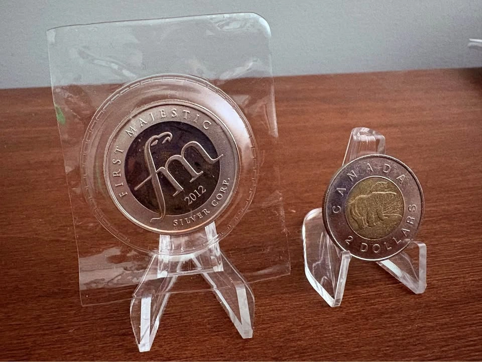 651/2oz .999 pure/fine silver bullion round by First Majestic Silver Corp in original mint bubble packaging. The obverse contains a detailed Mayan design, with the reverse displaying the First Majestic logo and the year of mintage (2012). Sigma precious metals verifier certified, see photos. Can meet in a public place in Maple Ridge. Include stand - add $3 The stand is too thick to be shipped letter mail, so would have to be purchased in person. Thanks! Price can be subject to change with significant market fluctuations in silver spot price.
