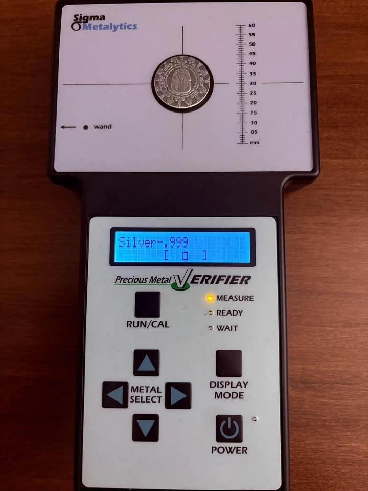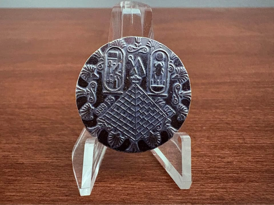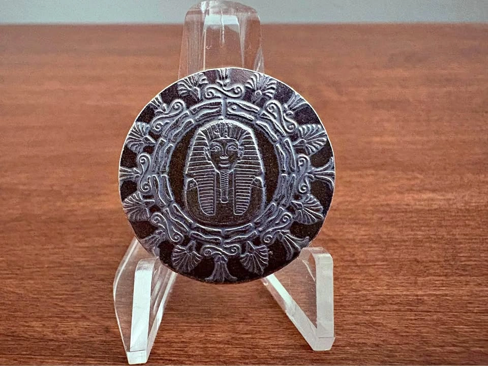651/4 oz .999 pure silver King Tut old world style round in mint condition. This round has been purposely made to look "old" in homage to ancient coinage of the past. No two rounds are exactly alike as they have been purposely hand struck off center and given an application of “antique" patina along with an "anti-polish" to add to the look of old world charm. Great original and meaningful gift idea that will only increase in value over time with the price of silver. In mint condition and Sigma precious metals verifier certified, see photos. Can meet in public place in Maple Ridge. Include stand - add $3 The stand is too thick to be purchased in person. Thanks! Price can be subject to change with significant market fluctuations in silver spot price.