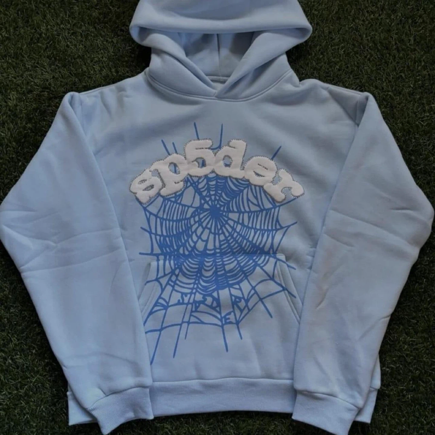 10Selling a Sp5der hoodie in a light blue colour, The hoodie features the brand's name in a unique font with a spiderweb design. It's in great condition and ready for a new home!