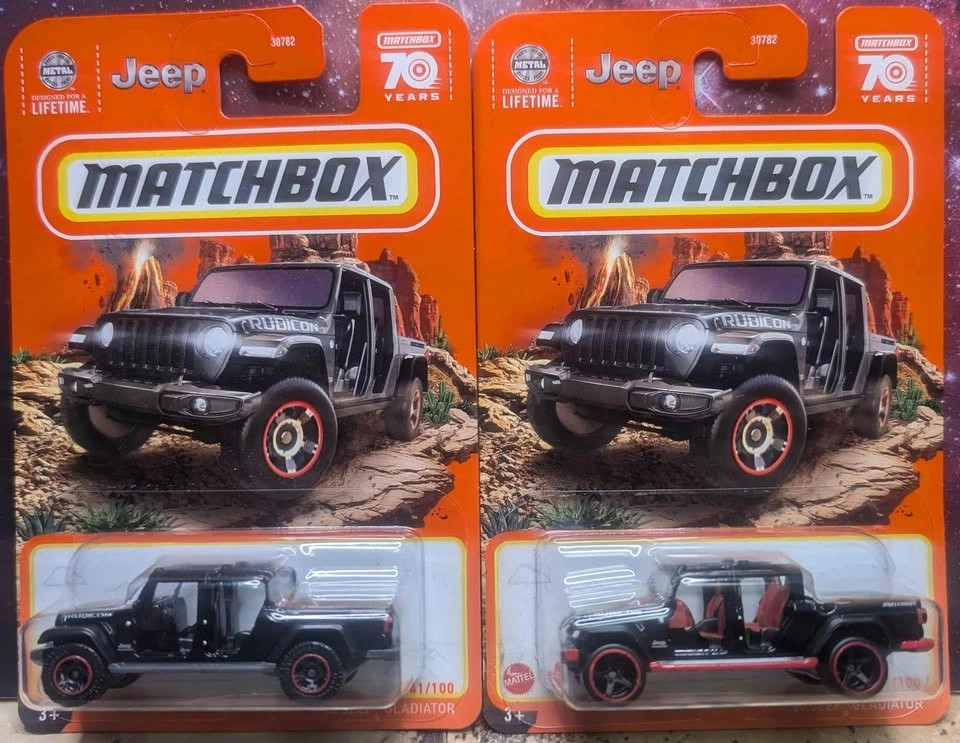 112💥One Of A KIND!💥Matchbox '23: Custom Deco/Tampo Wheel Swap, & resealed on card. 2020 Jeep Gladiator Original rivets replaced with epoxy resin for axle/wheel swap. Item was removed from packaging to add the following Enhancements & Decorations: •5 spoke negative/deep offset rims with Realrider™ rubber tires. (Removed from a Hot Wheels Premium Lamborghini Urus) • Red line painted on new rims • Painted side sliders/running boards • Painted under chassis details • Painted front & rear bumper details • Painted bed liner • Painted Interior • Painted pedals & floor mat (driver side) • Added Lens decorations - Headlights, Front fender drive lights, Front bumper fogs, Rear bumper markers, "Rear" tail lights (side of taillights are factory details), Reverse lights. The Jeep was then re-sealed on its original card. There is minimal to zero detectable damage done to the package. The second Jeep (bottom in photos) is only to show the difference of the added details, and is "not" included in the price. If you're reading this it's still available. Price is Firm. It's Twenty-five bucks! Or show me what you have to trade? Meet up locations: For people taking TTC: I'll meet at Main or Victoria Park Station (Bloor/Danforth line) For people with private transportation: anywhere within a 10min drive of Victoria Park & St. Clair