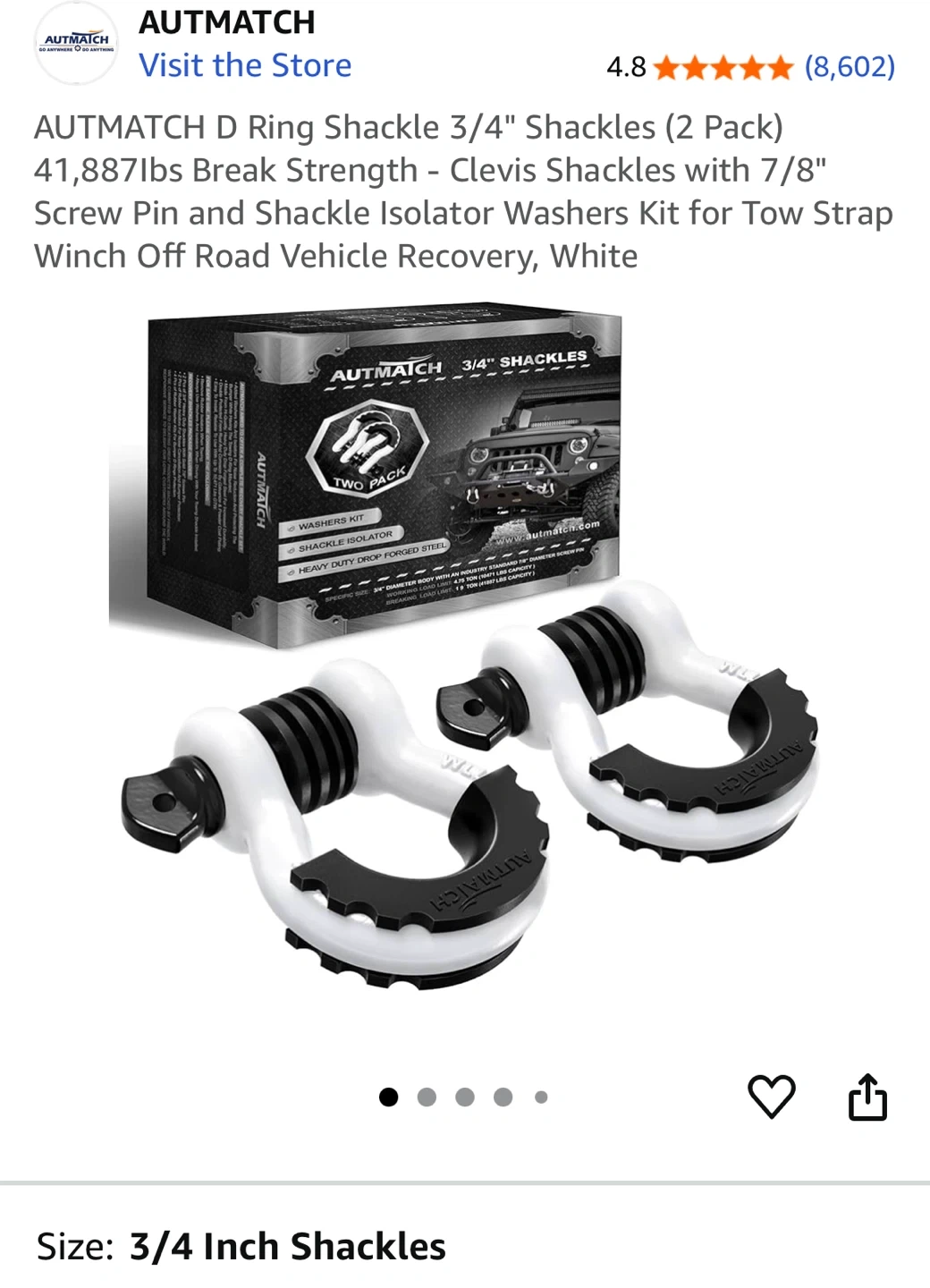 Selling ONE D Ring Shackles, 3/4" size! These shackles have a break strength of 41,887lbs and include clevis shackles with 7/8" screw pin and shackle isolator washers. Perfect for tow strap winch off-road vehicle recovery