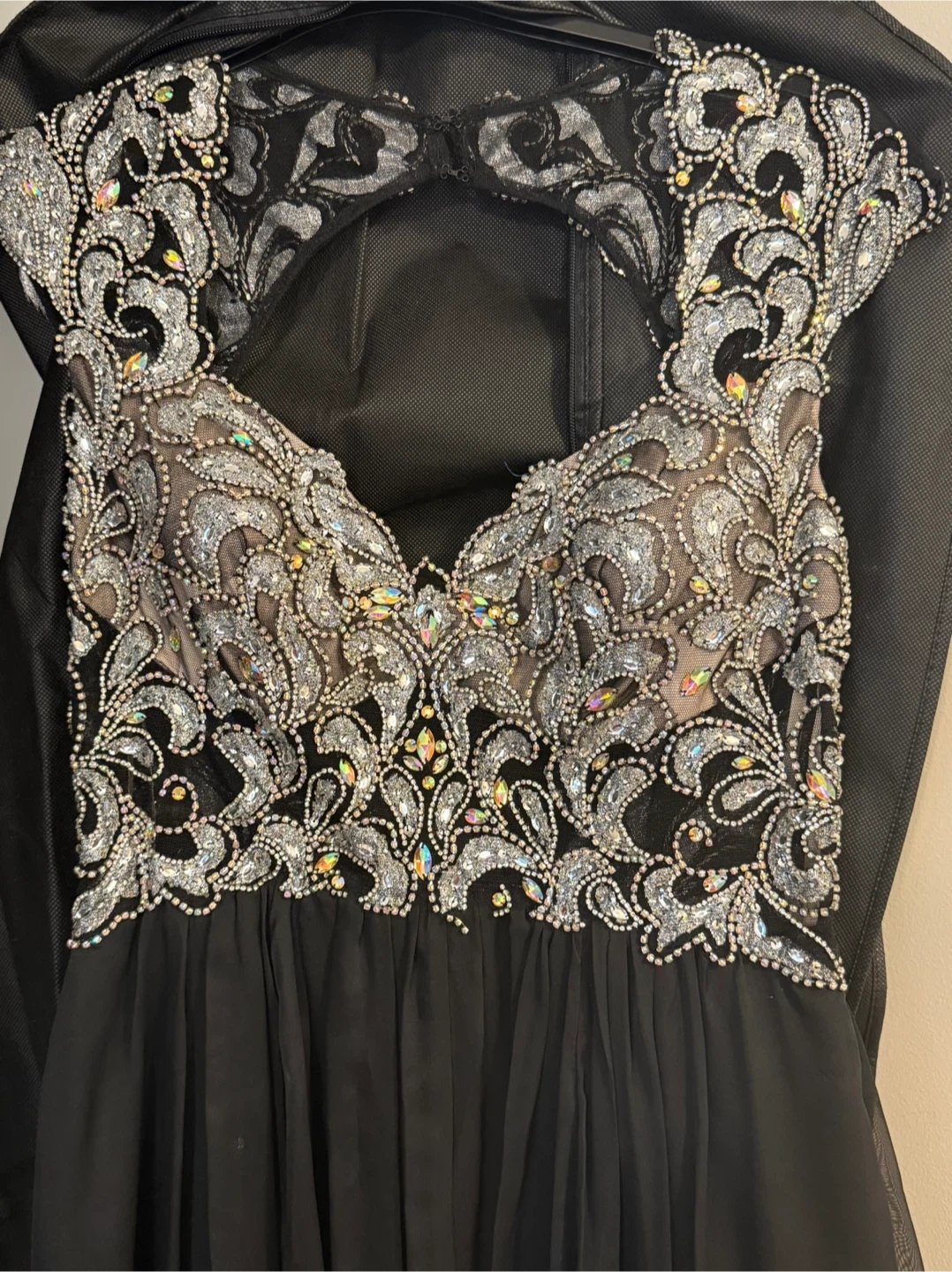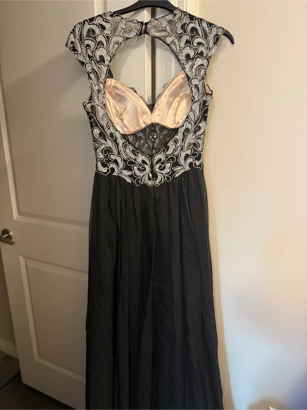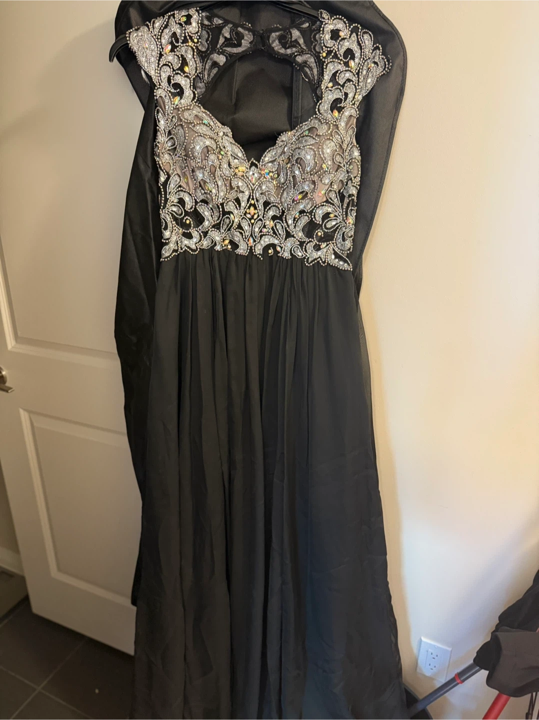 182Beautiful black gown from 1ère Avenue! It features intricate embellishments on the bodice and a flowing skirt. Perfect for a special occasion! With the collar and earrings. Dress size 10, used one time for special event. All for 50$ Pickup only
