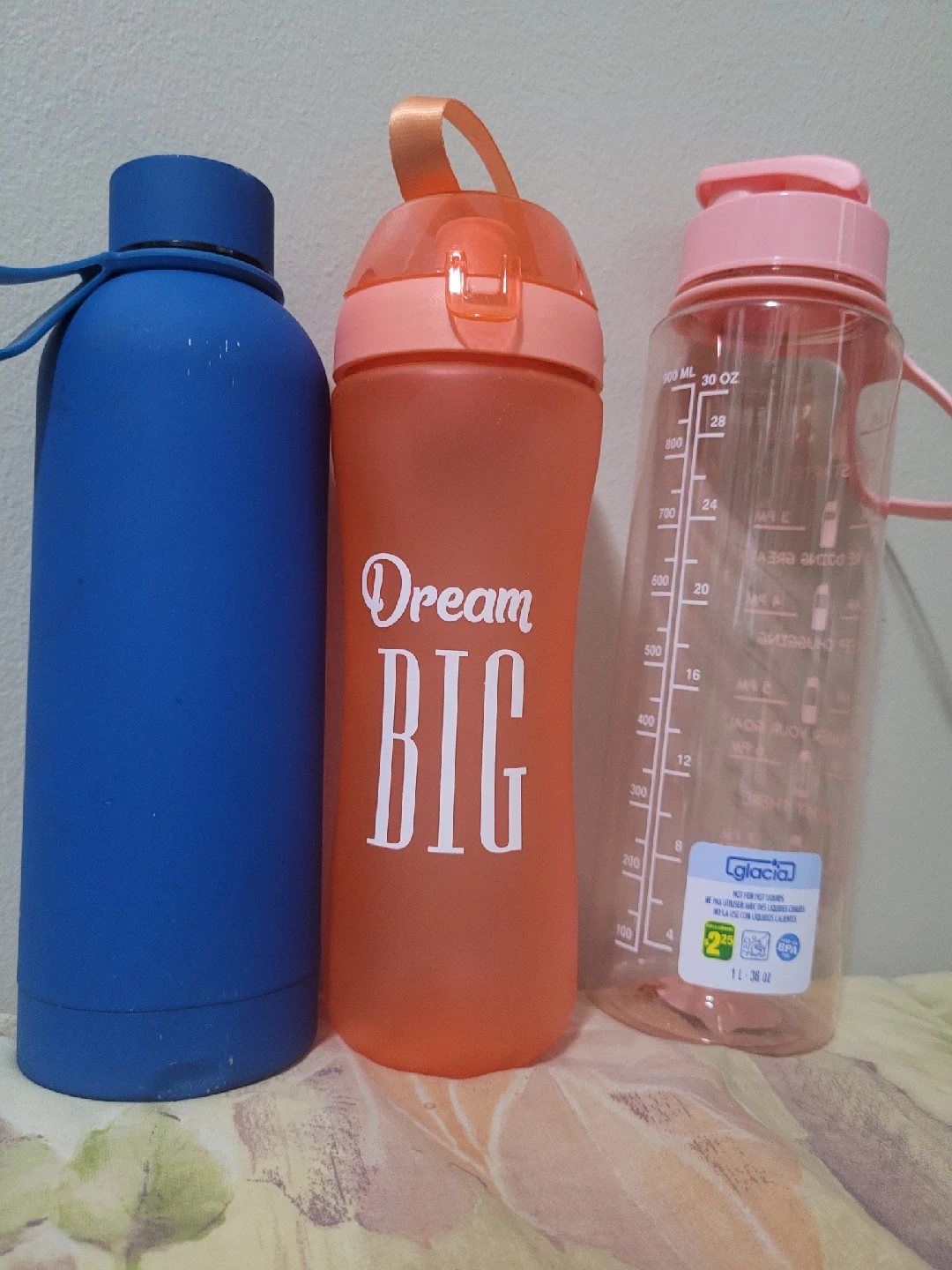 1000+Selling a set of water bottles! One is a blue insulated stainless steel bottle, another is an orange bottle with 'Dream BIG' written on it, and the last is a clear Glacial bottle with volume measurements. Perfect for staying hydrated!