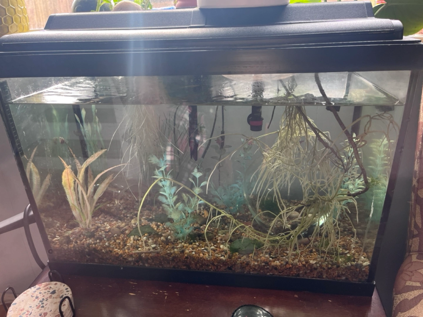 Used fish tank. Includes gravel and plastic plants. Black frame. Good condition.
