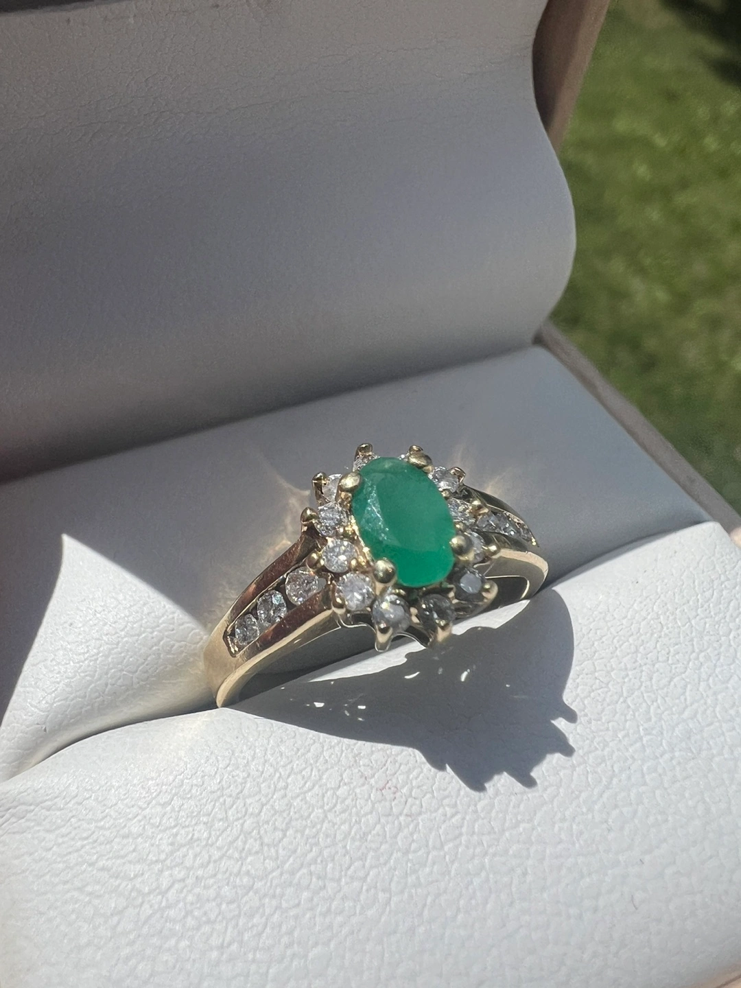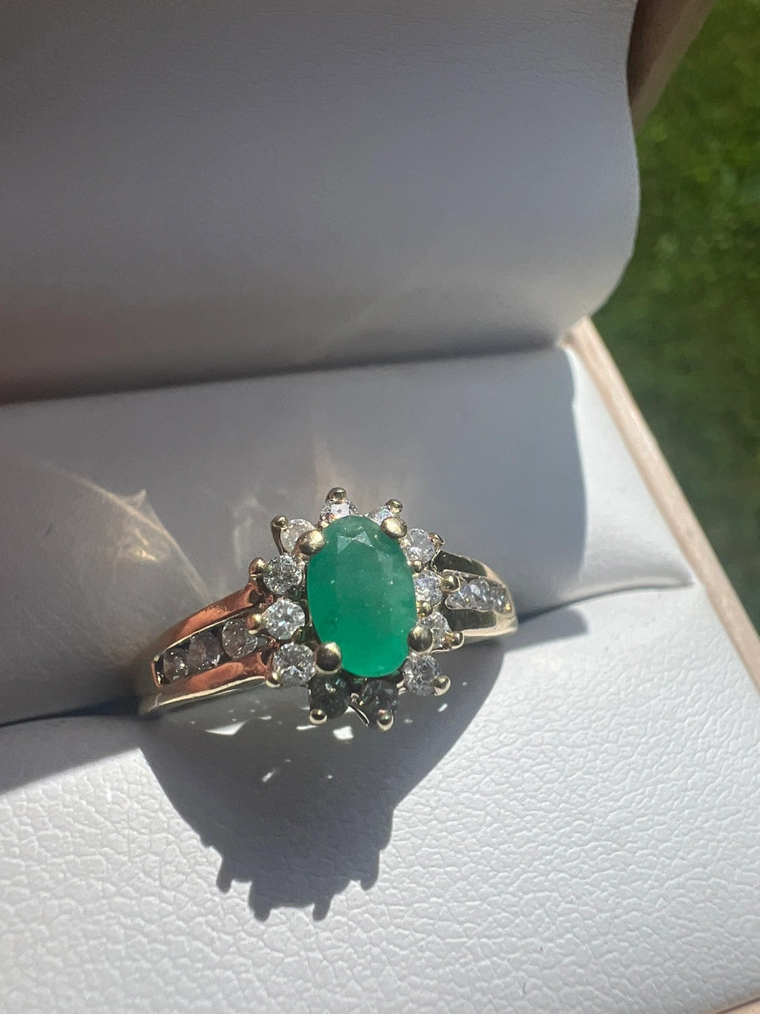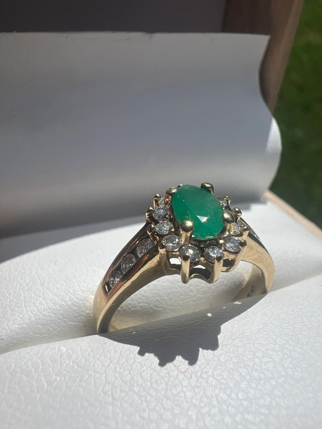 Selling a beautiful 10 k gold ring featuring an emerald stone surrounded by diamonds. It's in great condition and ready to add a touch of elegance to your collection