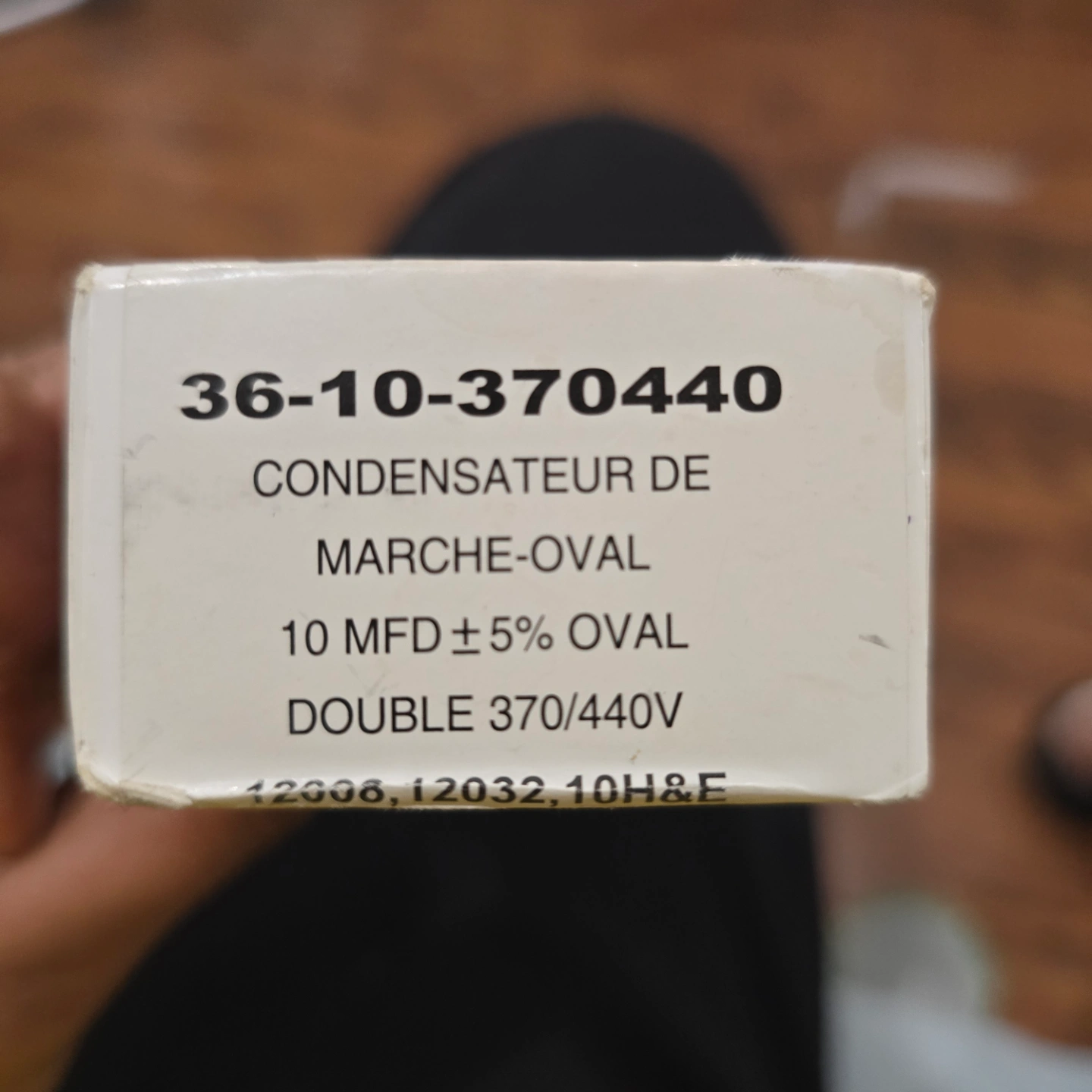New, unused capacitor. 10 MFD ±5% Oval Double 370/440V. Part number 36-10-370440. Comes in original packaging.