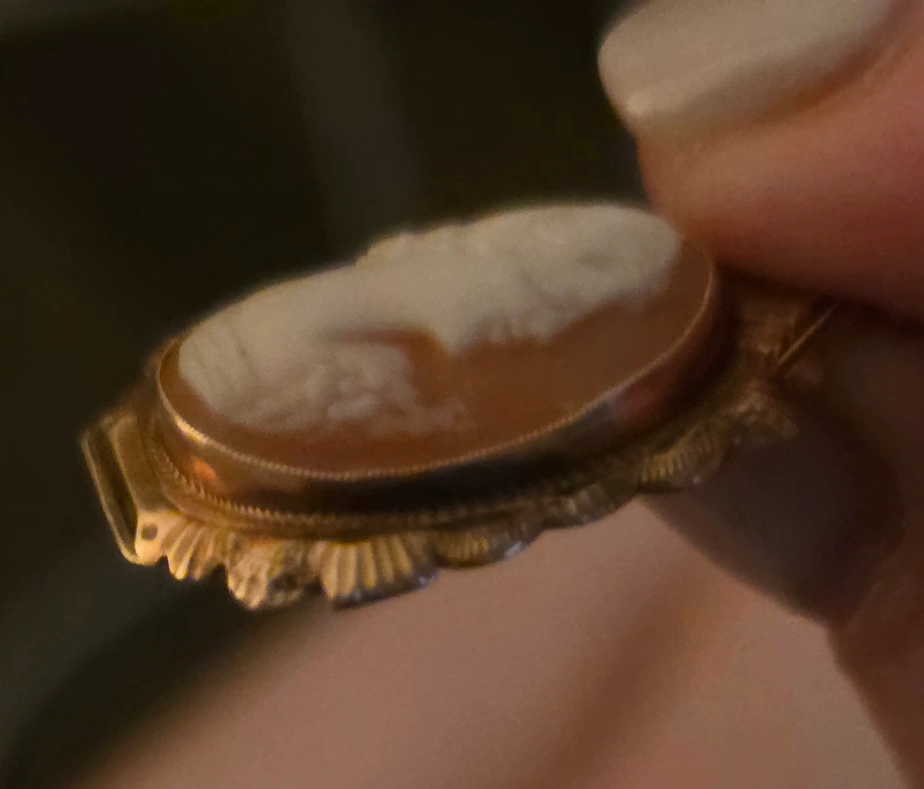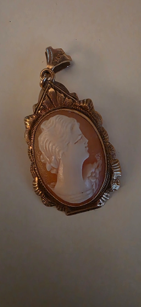 Selling a real gold vintage cameo pendant. It features a classic design and has a gold-tone setting embedded in coral. Perfect for adding a touch of vintage charm to any outfit!