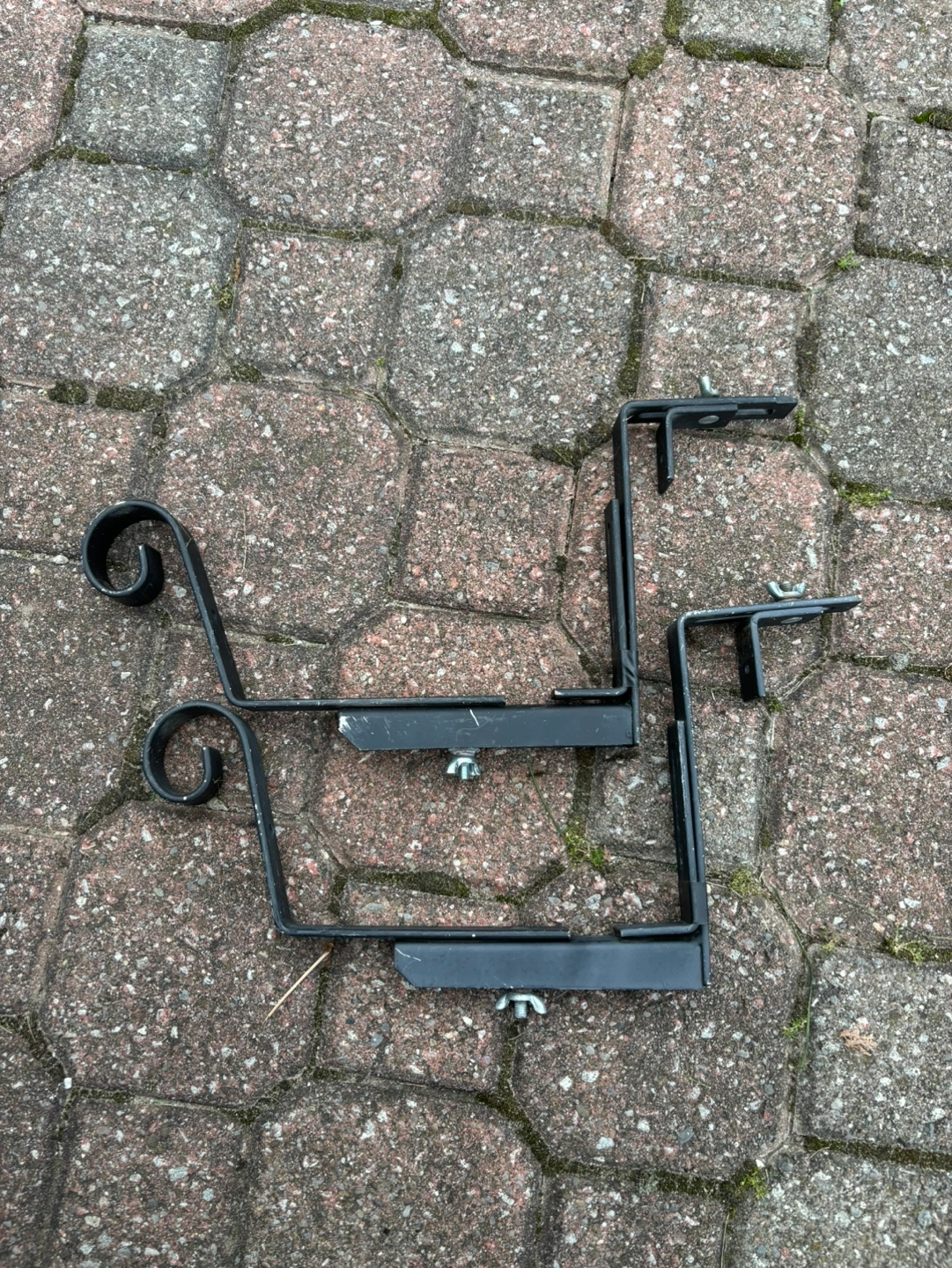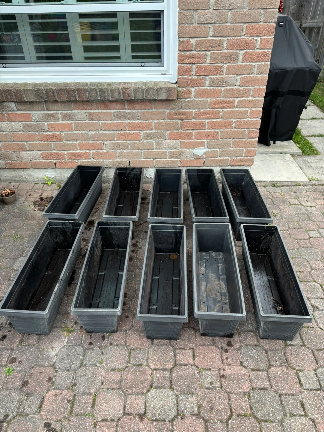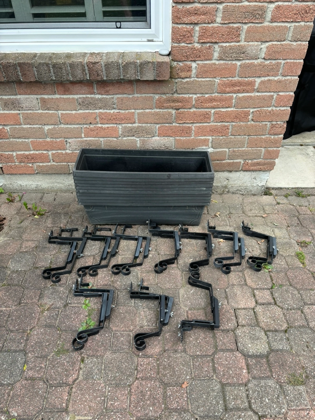 145A set of 10 Rectangle balcony planters. No cracks. Comes with matching mounting brackets. Measures 30x10x9.5”. Shows some outdoor wear. Just need a clean