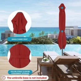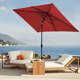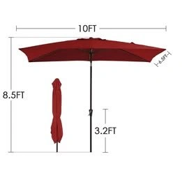 60New in box. Features a 6.5x10ft rectangular patio umbrella that shades your 42" - 54" round, square, or rectangle table with room for 4 to 6 chairs. Made of heavy-duty anti-UV polyester fabric 100% polyester 220gsm, waterproof, fade resistant, and UV protection. 6 sturdy square heavy-duty ribs provide stronger support than standard round poles. The 1.5-inch diameter pole can fit into most umbrella stands. The size of 6' 5" x 10' shades your area with at least 5-8 chairs and tables, ideal for both residential and commercial locations. Built with powder-coated steel pole against rust, corrosion, chipping, and peeling. Please note this patio umbrella must use the extra weight or be nailed on the deck. Press the push button to tilt for more angle shade. The umbrella base is not included.