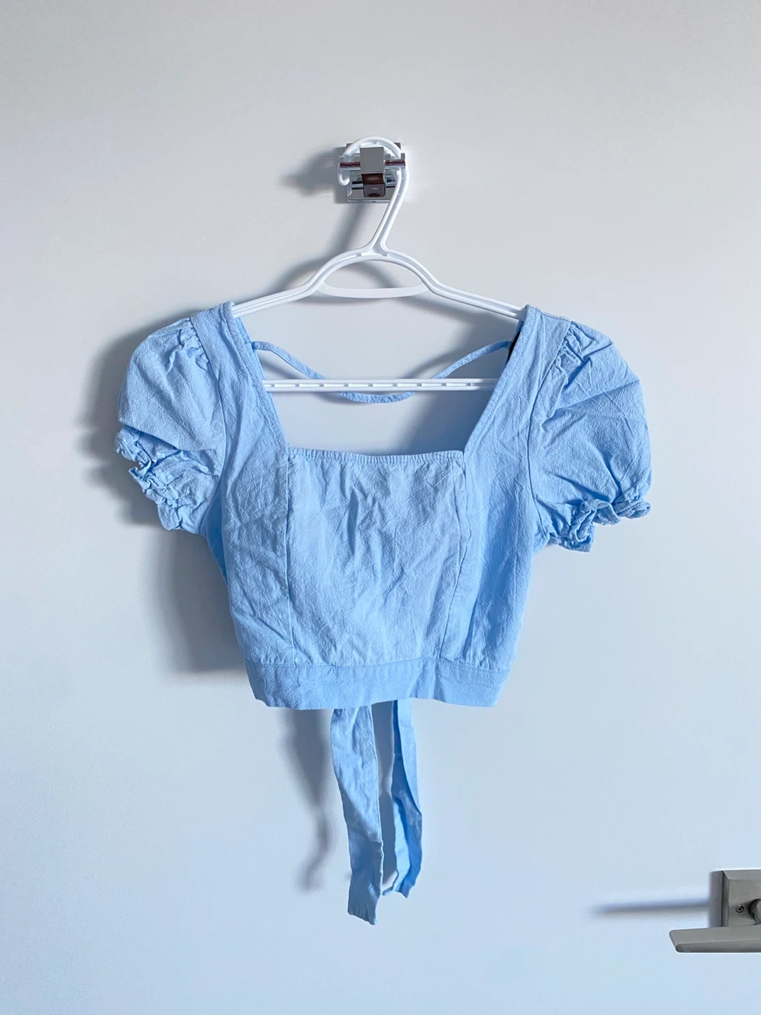 100% Cotton top in cute blue colour with bow detailing on the back! Its has beautiful princess puff sleeves and flattering square neckline. Size small. Never worn condition. ❤️ Check out my other listings for great deals!