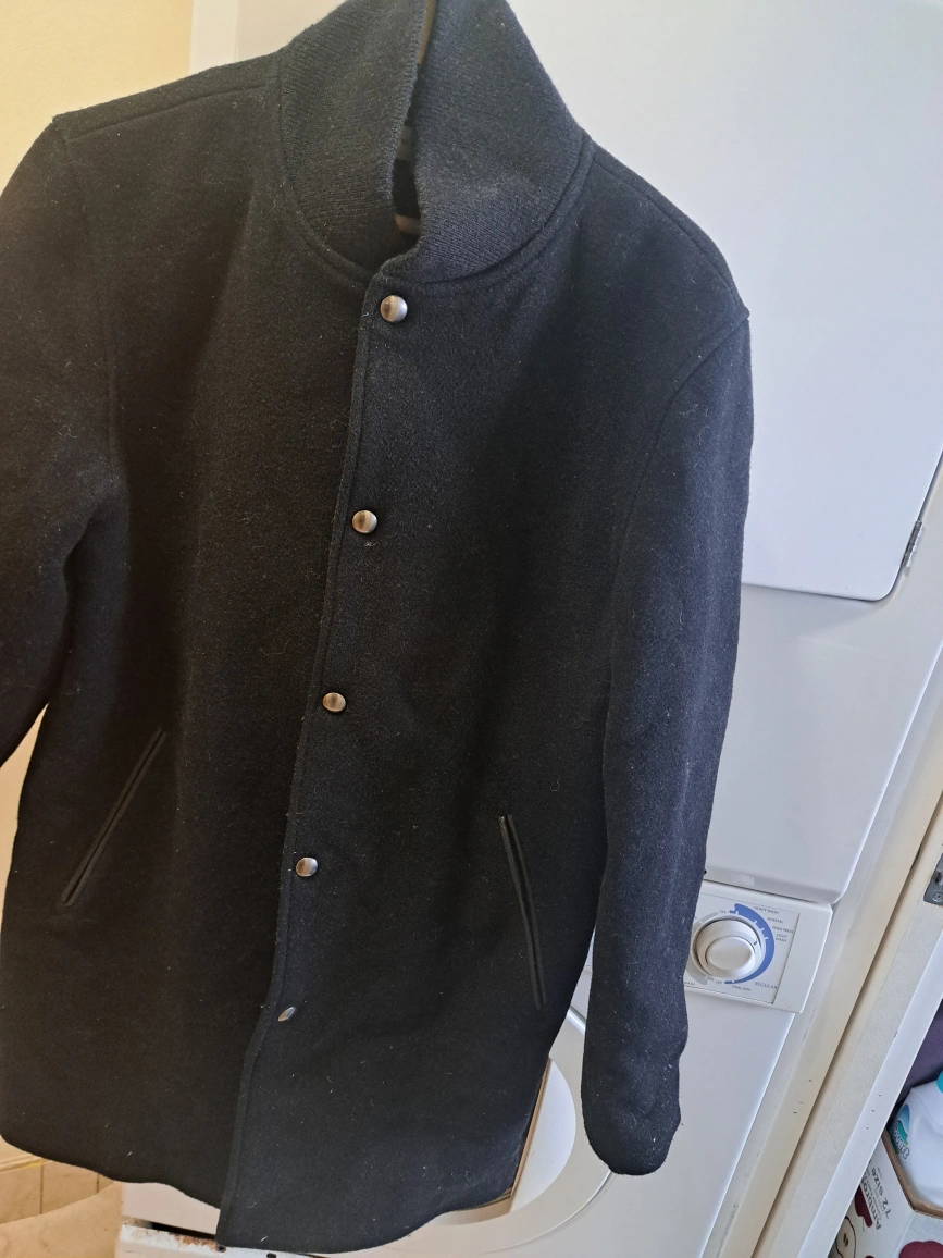 82amazing jacket!! great quality!! wool shell / quilted lining. ....brass snap buttons....side pockets...interior pocket. perfect gauge of wool for the west coast