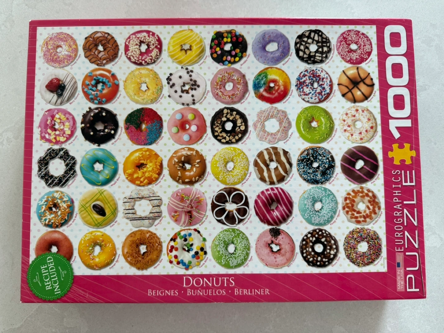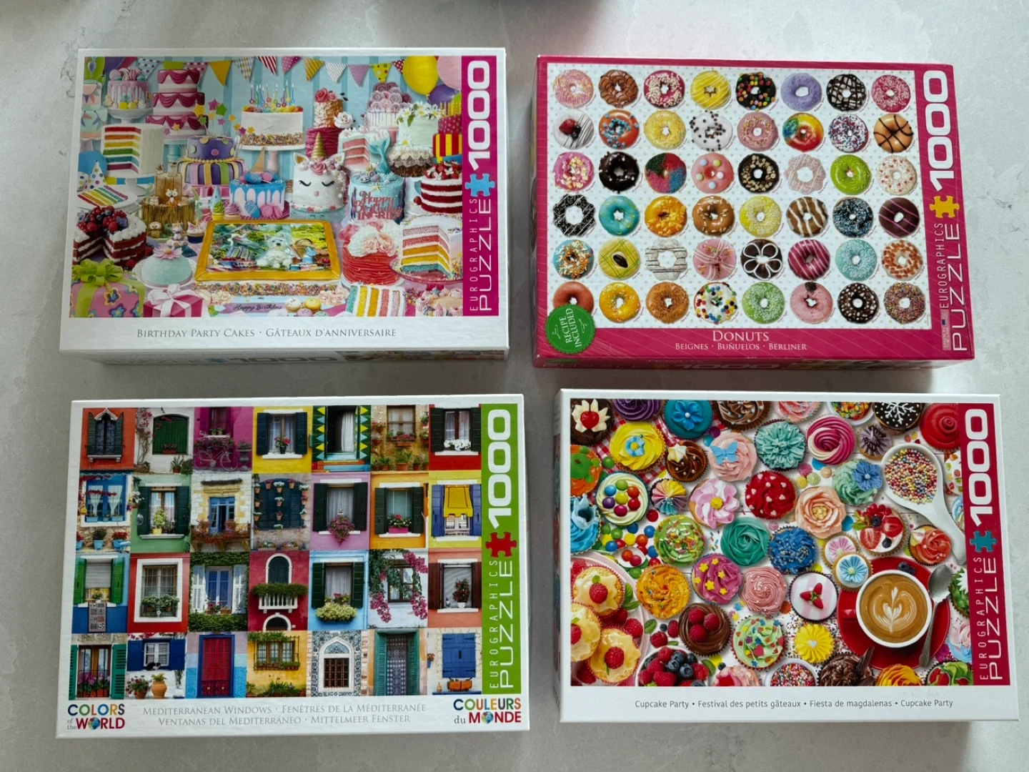 I have four Eurographics 1000 piece puzzles for sale! They are all used once like new condition. - Colors of the World: Mediterranean Windows - Donuts - Cupcake Party - Birthday Party Cakes Remainder of Puzzles are $10 each -Schitts Creek -Pencils - Animals