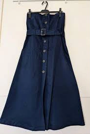 Dress has elastic at the back so is very accommodating for sizing. It also has a belt which is sealed in a pkg which can be cinched or loosened. The dress can be worn strapless or with a shirt underneath for a different style if you don’t want the strapless look