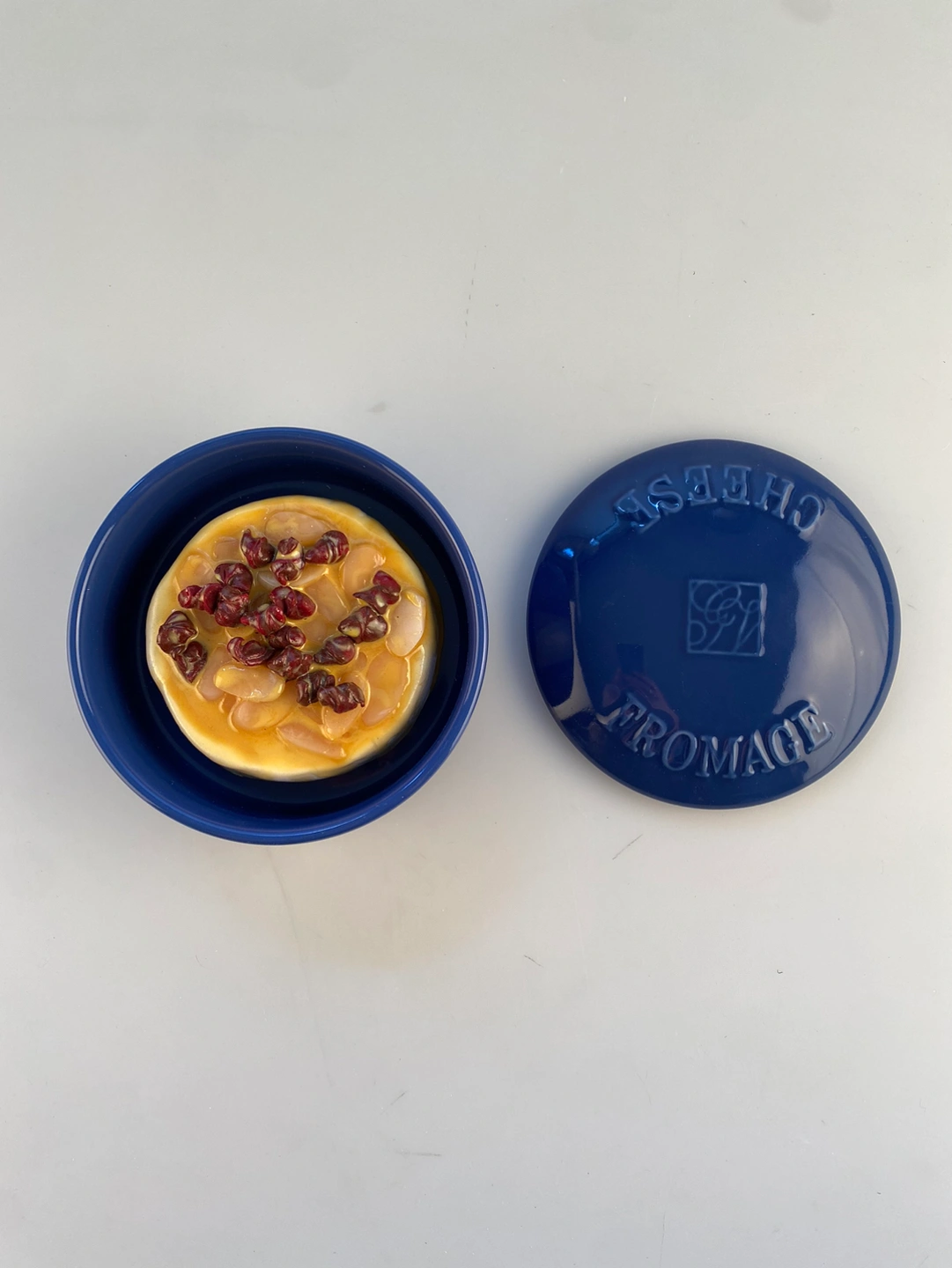 The Brie in the photo is fake food. New in Box. Dishwasher, Microwave & Oven Safe.. The 5” x 2” x 5” small dish can be used for pretty much anything.
