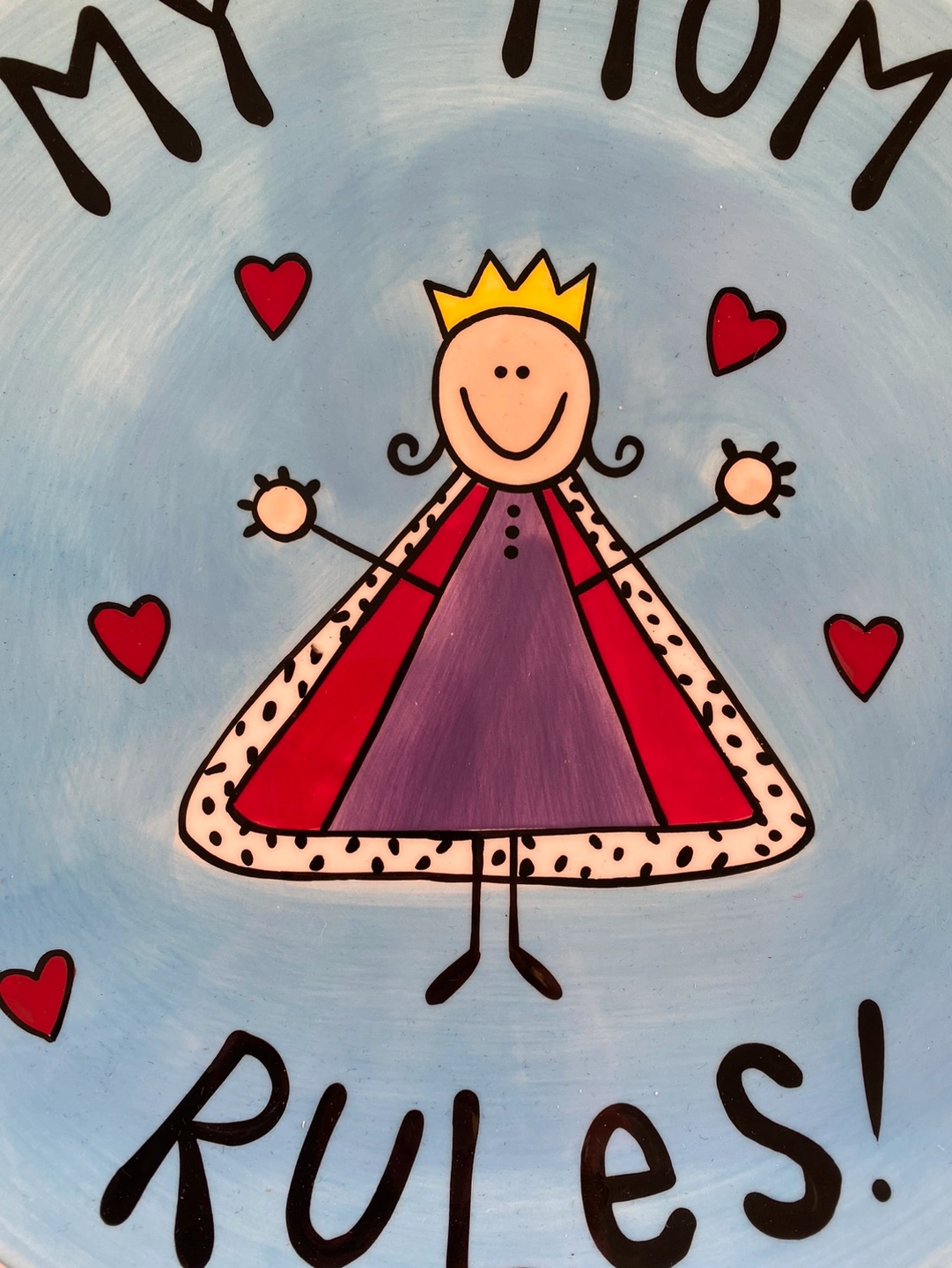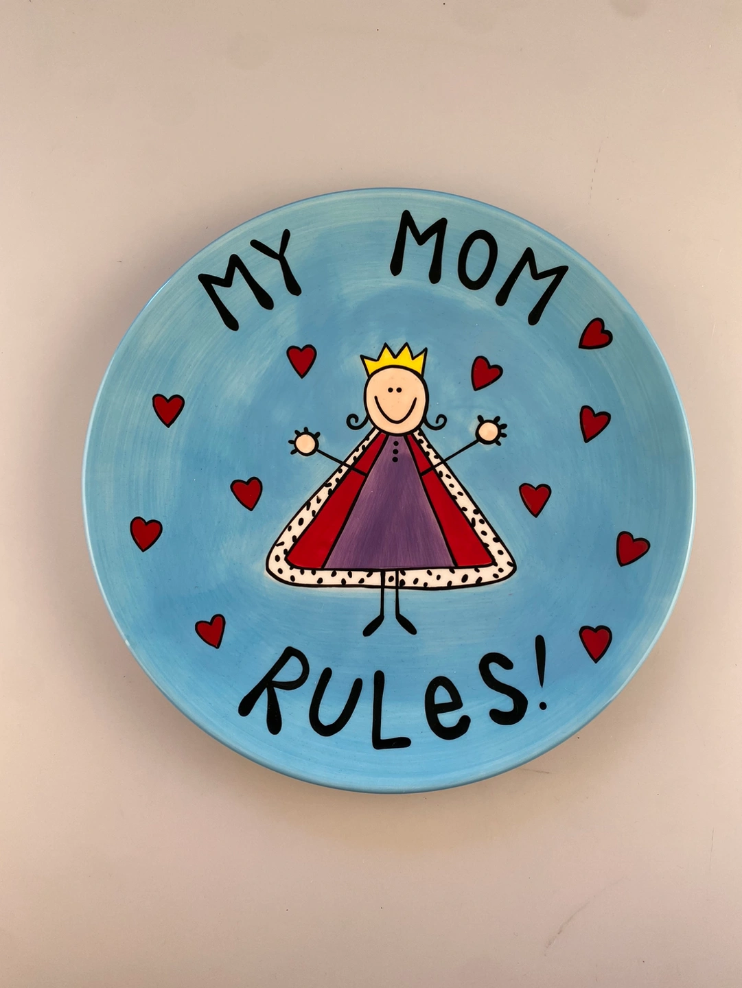 This colourful bright blue platter by Lorrie Veasey - Our Name is Mud features her royal highness queen mother in the center surround by floating red hearts and the saying “My Mom Rules!”. It’s the perfect gift for any awesome mom.
