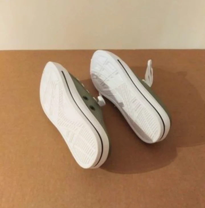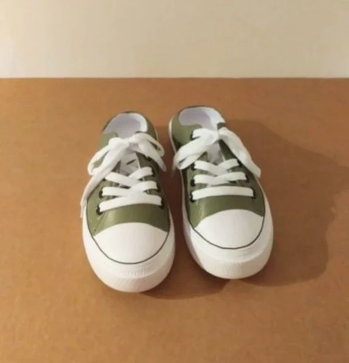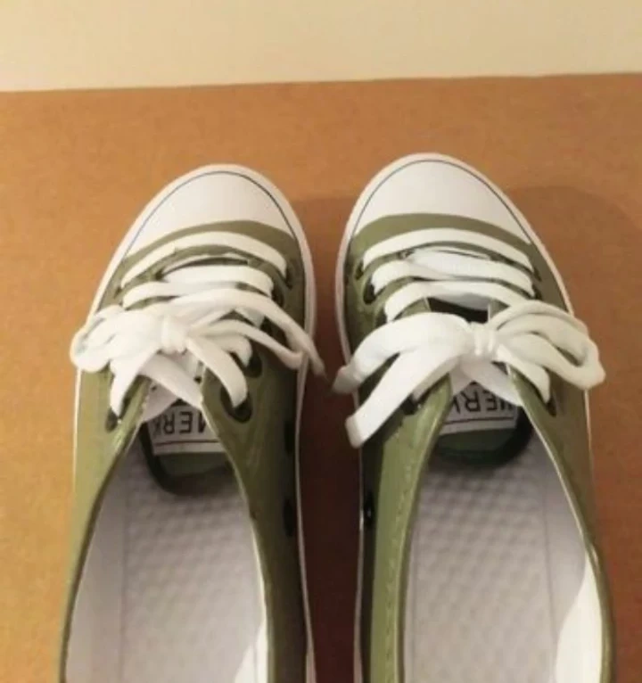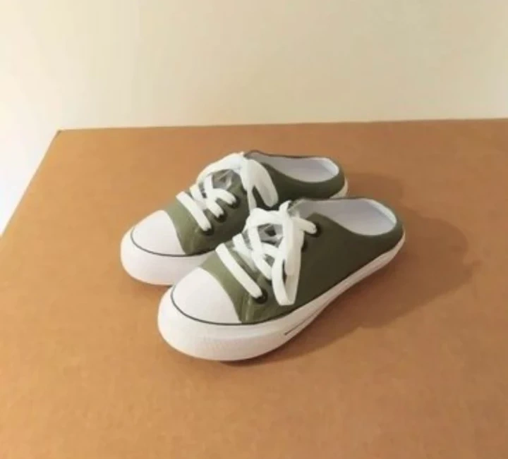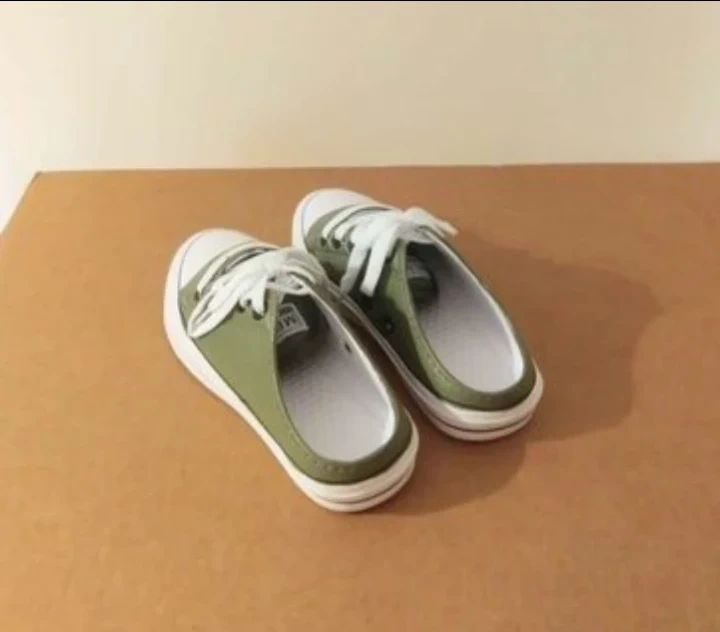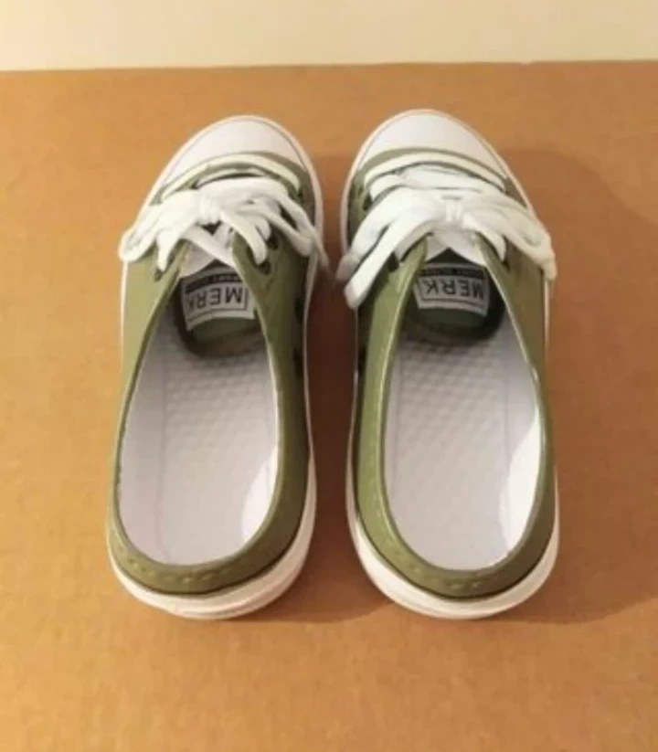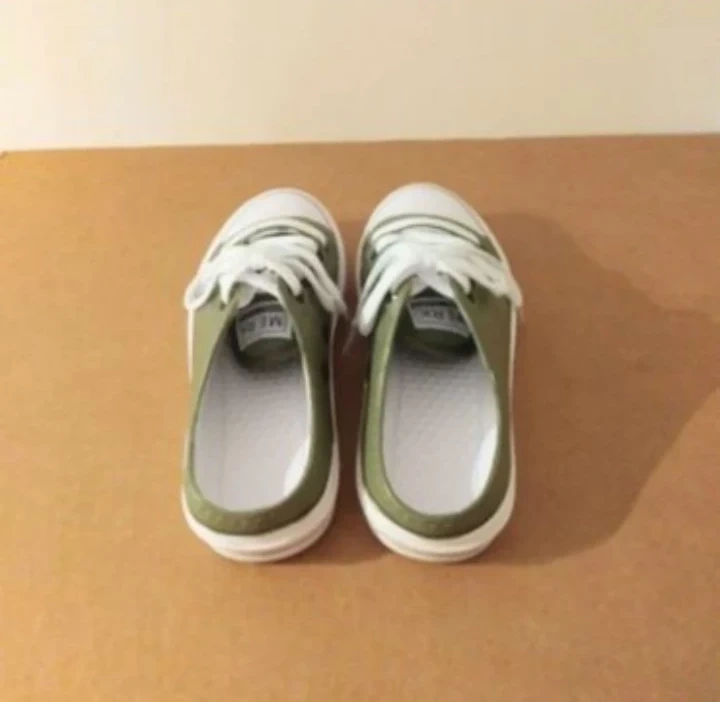 A pair of brand new MERK open back canvas shoes (aka mules). The olive green backless shoes are laced up style and have rubber soles.