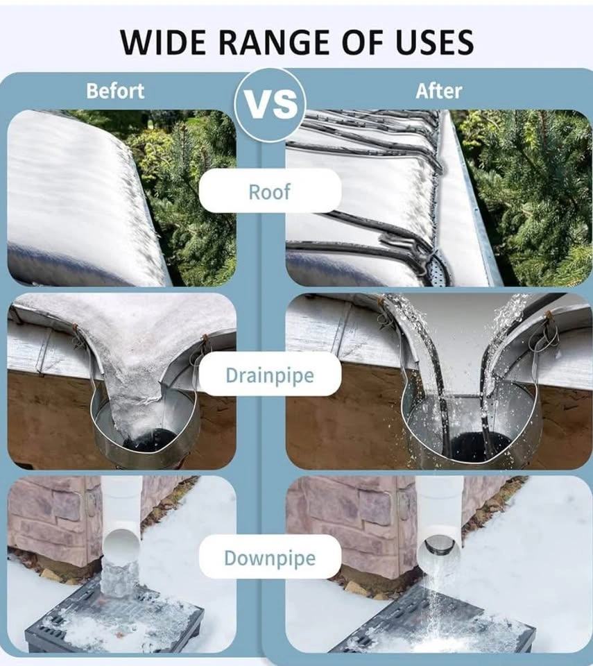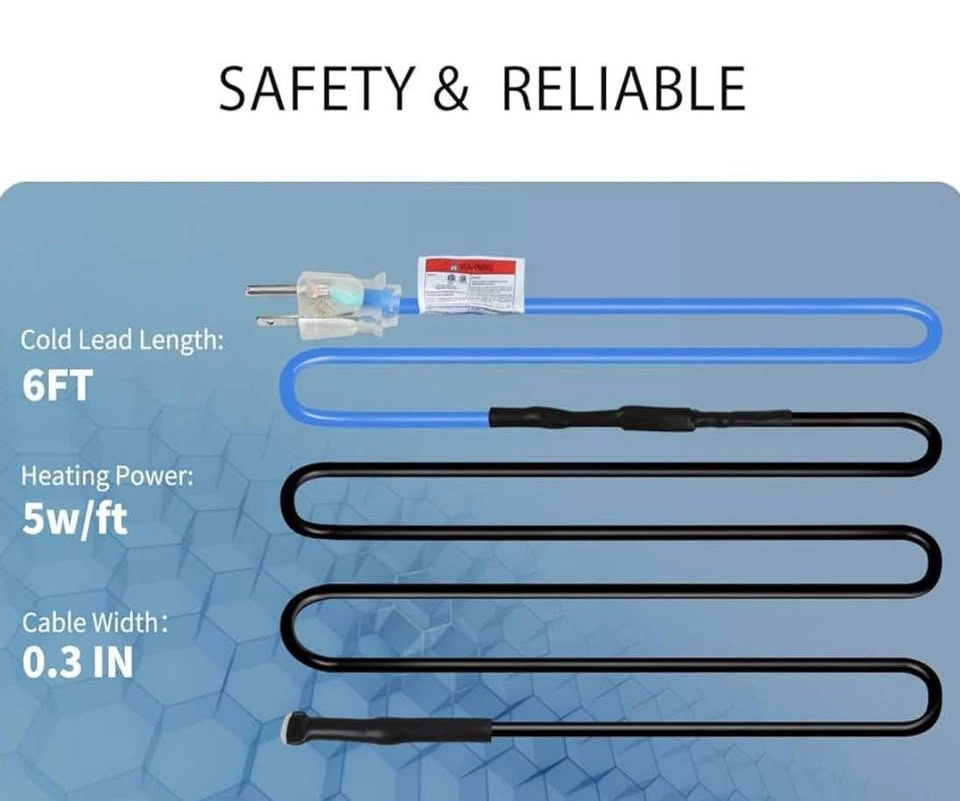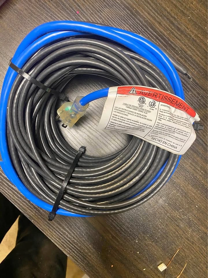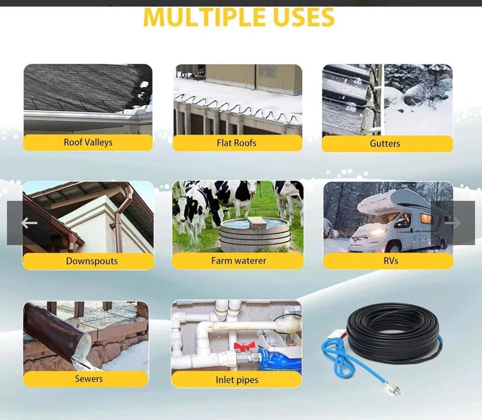 Constant wattage heating cable Purpose: Prevents ice dams on roofs, gutters, and downspouts Compatibility: Metal/plastic gutters & downspouts Construction Inner insulation: Tough XLPE Outer jacket: Weather-resistant PVC Shielding: 100% coverage (aluminum foil tinned copper braid) Cold Lead: 6 ft, 18/3 with plug Certifications: CSA & ETL approved