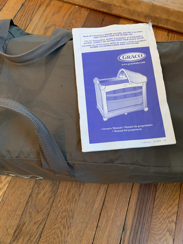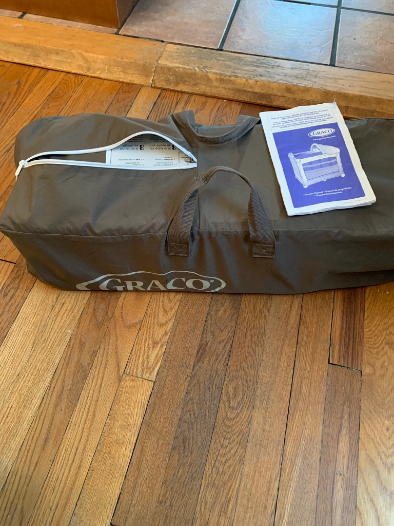 GRACO playpen , 3 stages , from newborn under 15lbs to toddler under 35” tall. Booklet included. Comes with the carrying case.