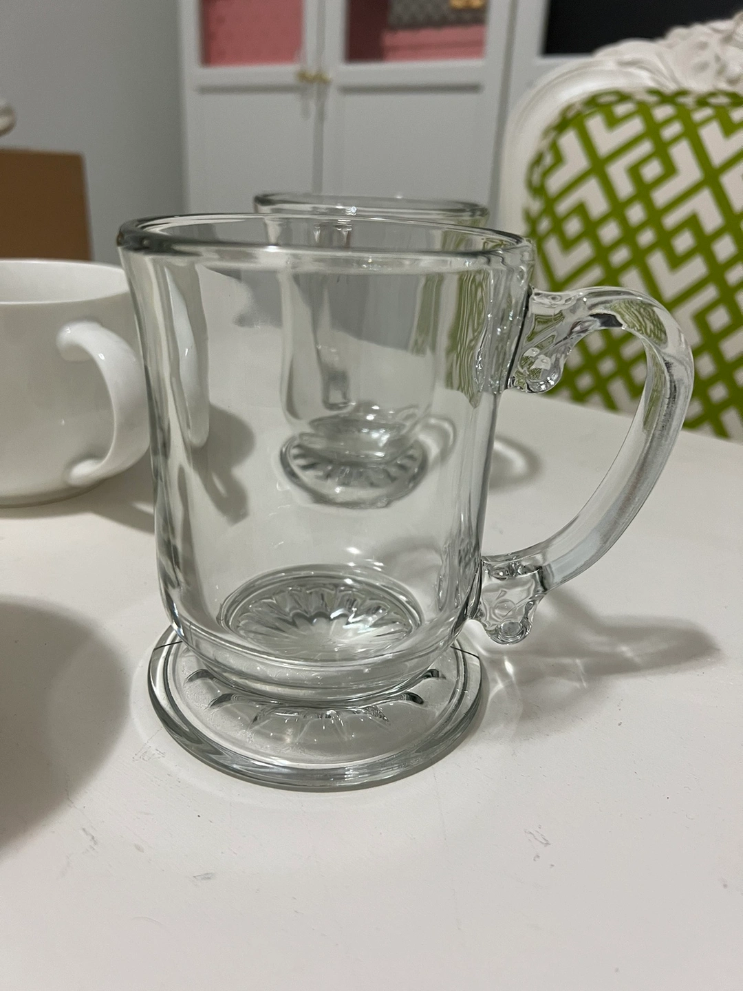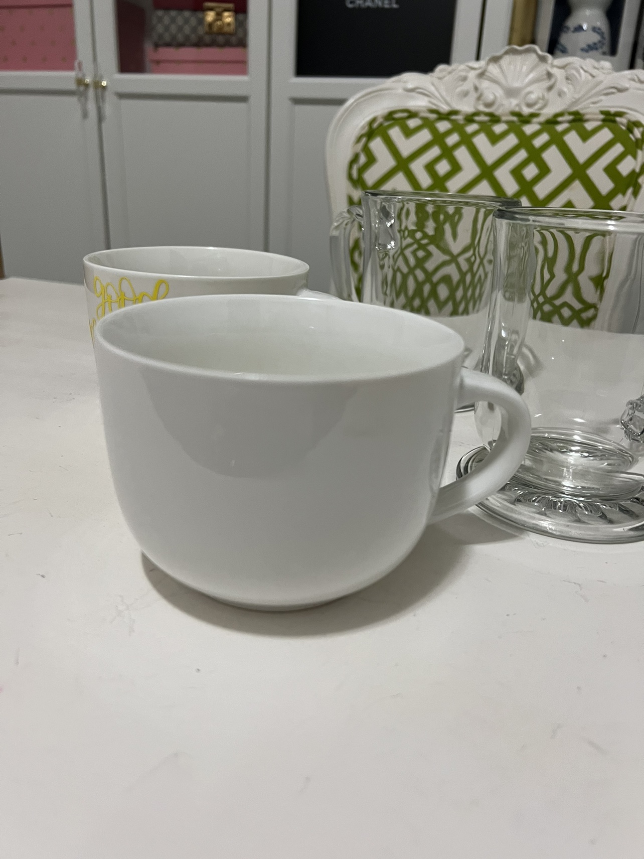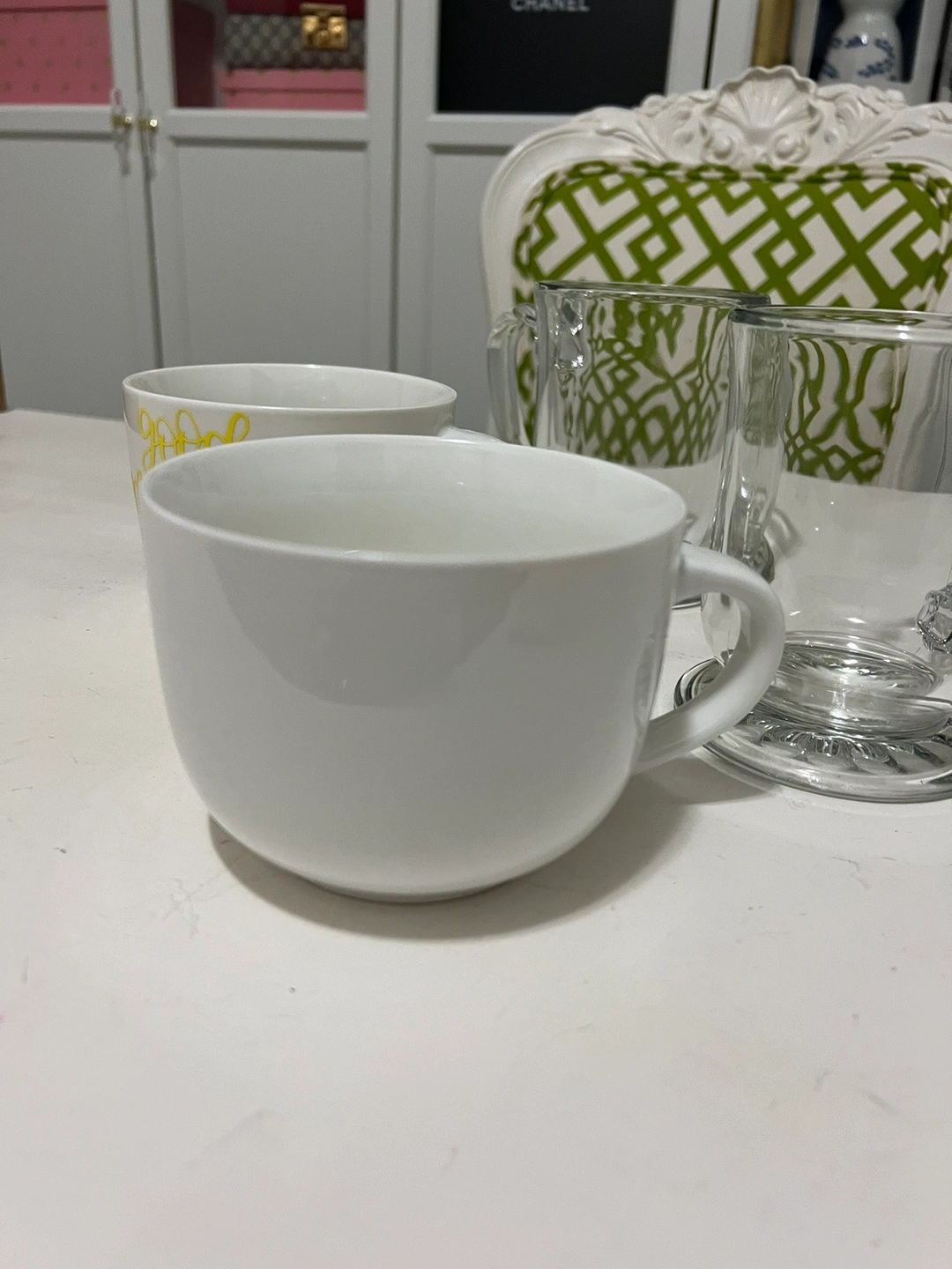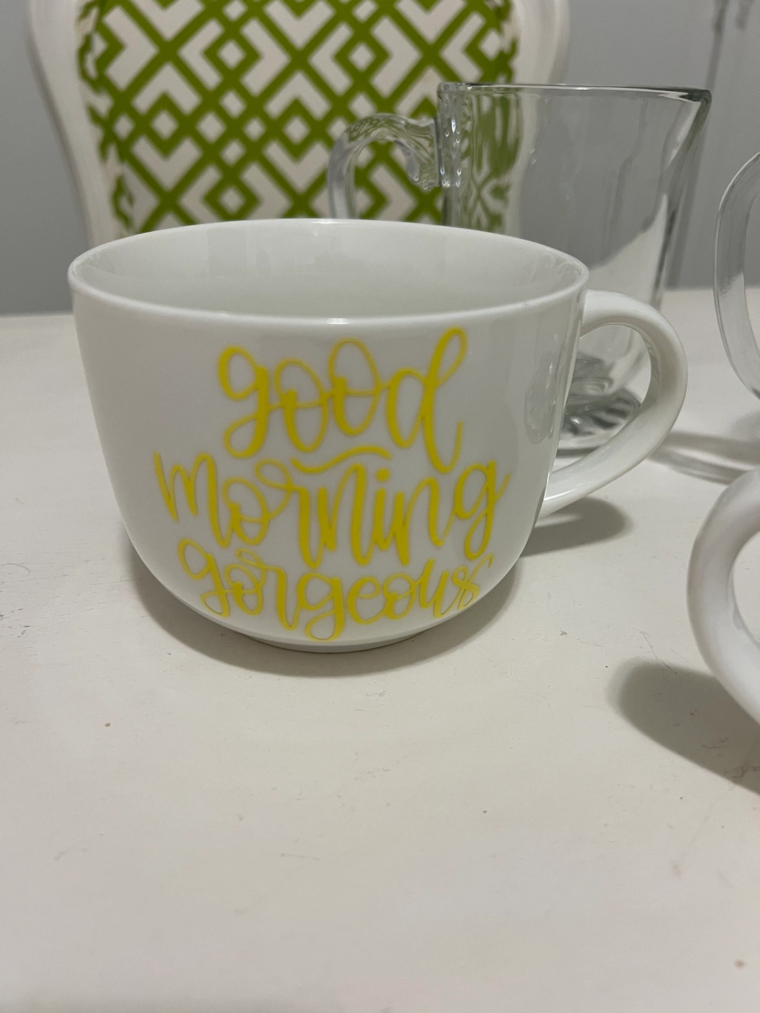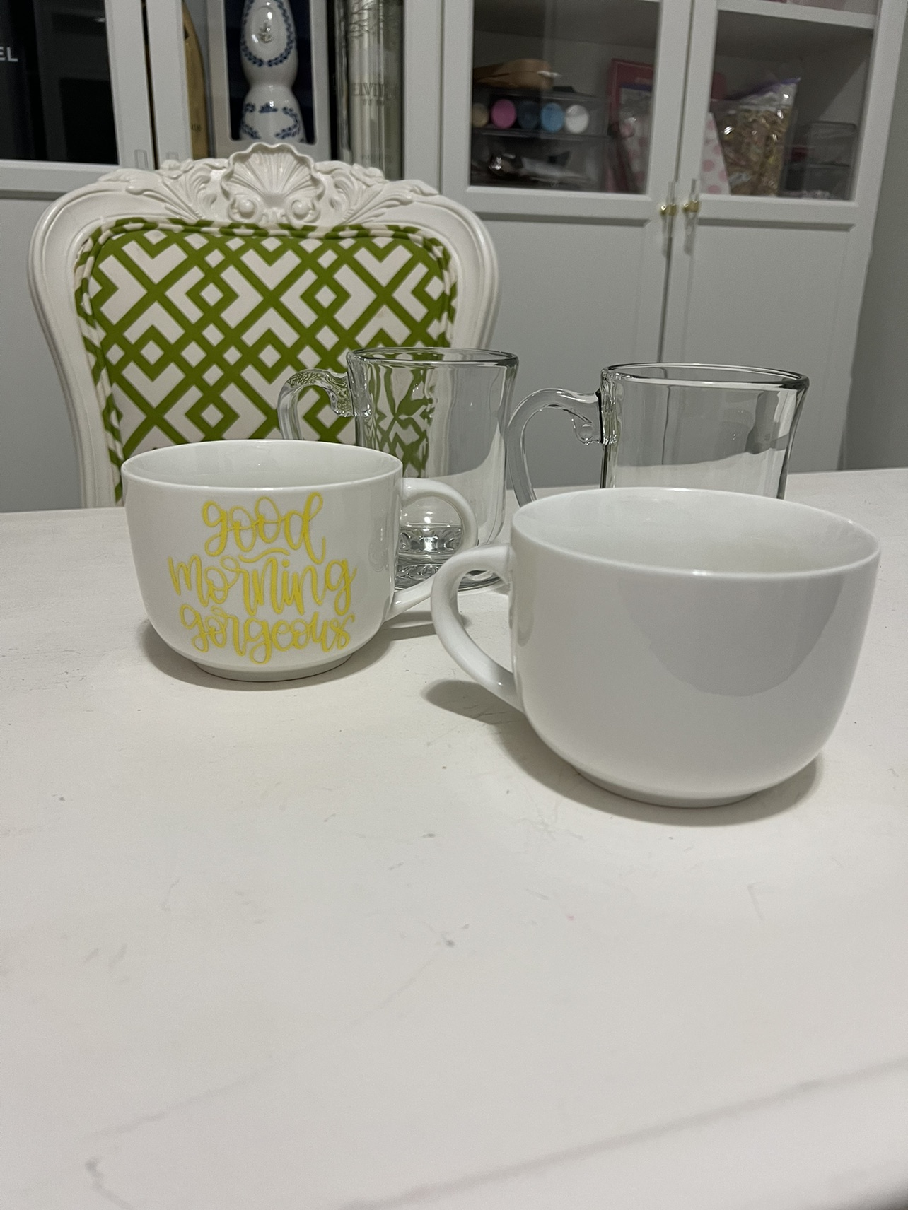 393One mug says good morning gorgeous, one white mug, and 2 clear glass mugs. 4 mugs $1.00