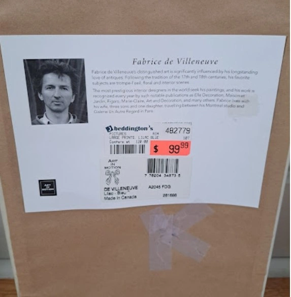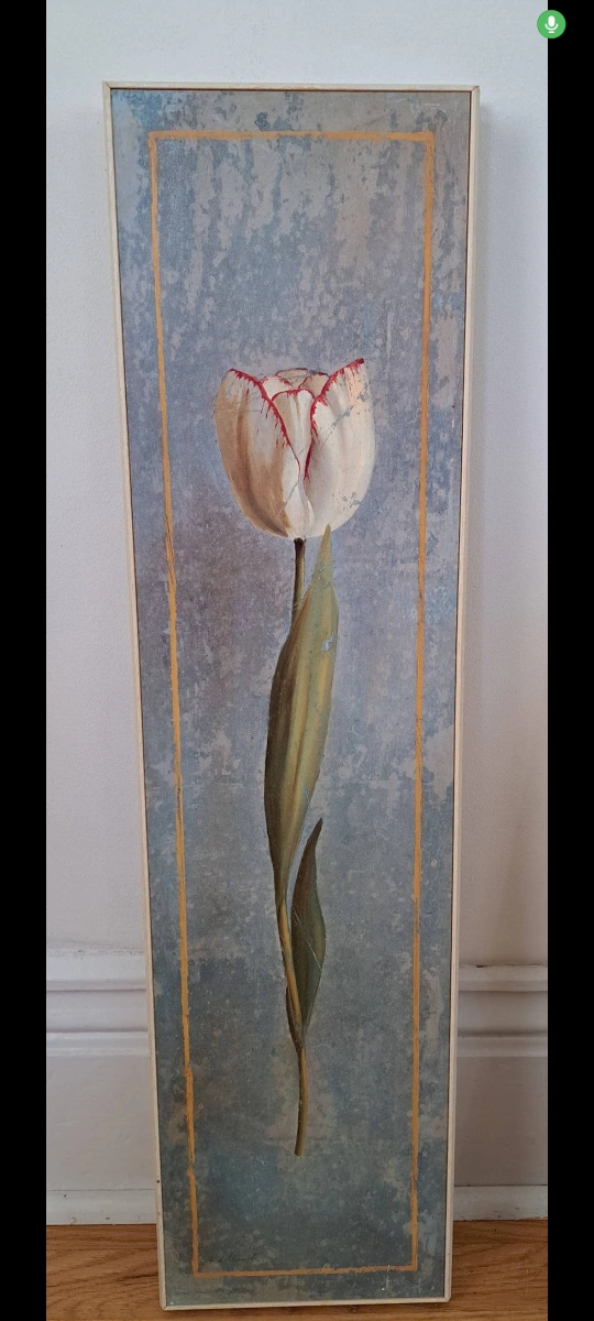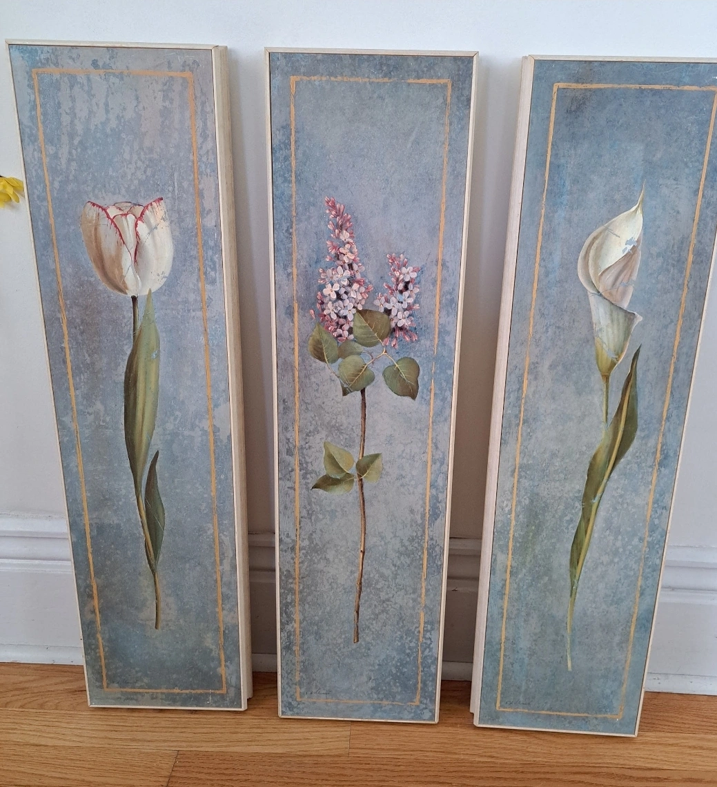 Trio of flower pictures on wood by Fabrice de Villeneuve. Distressed frame.