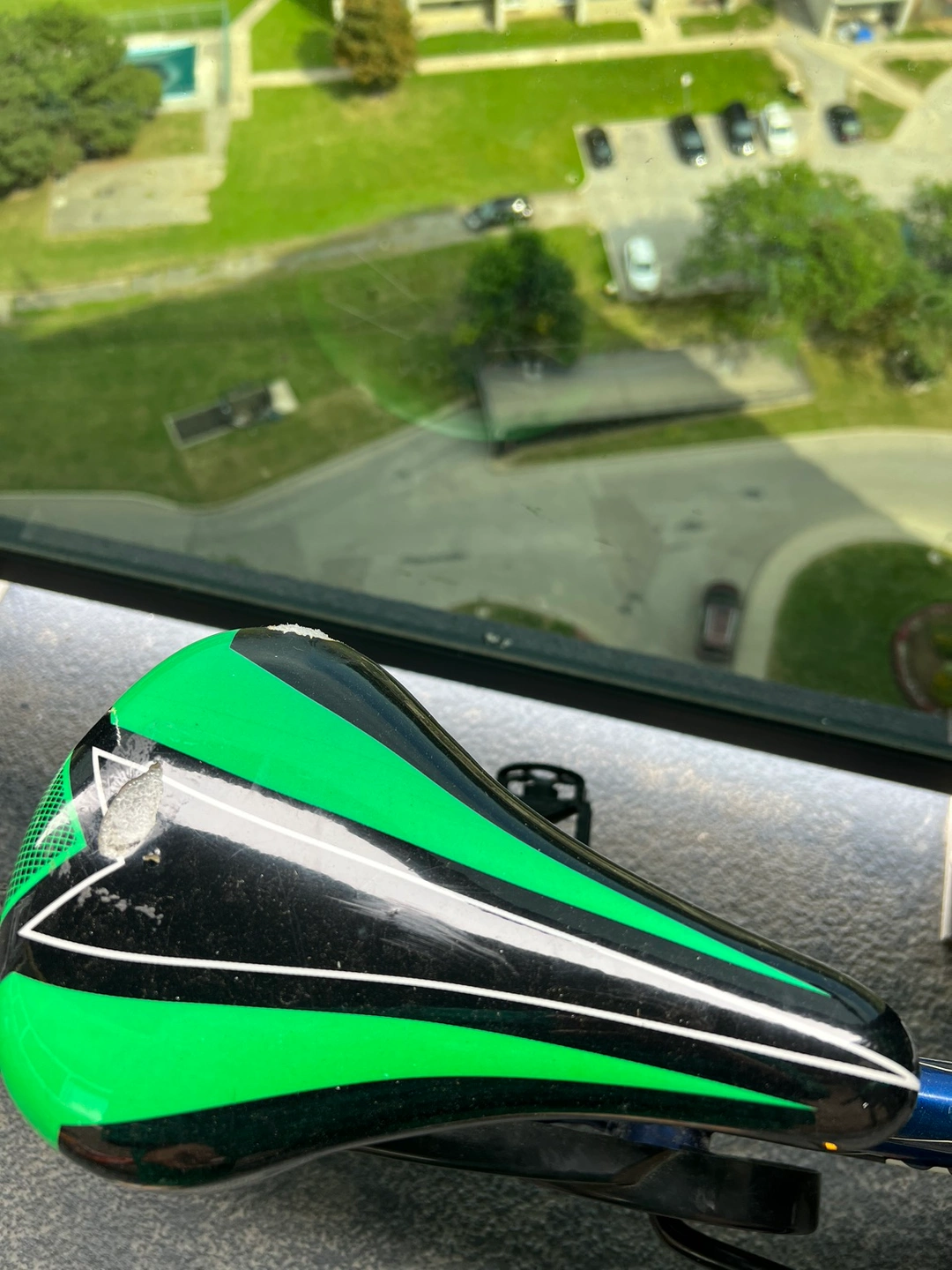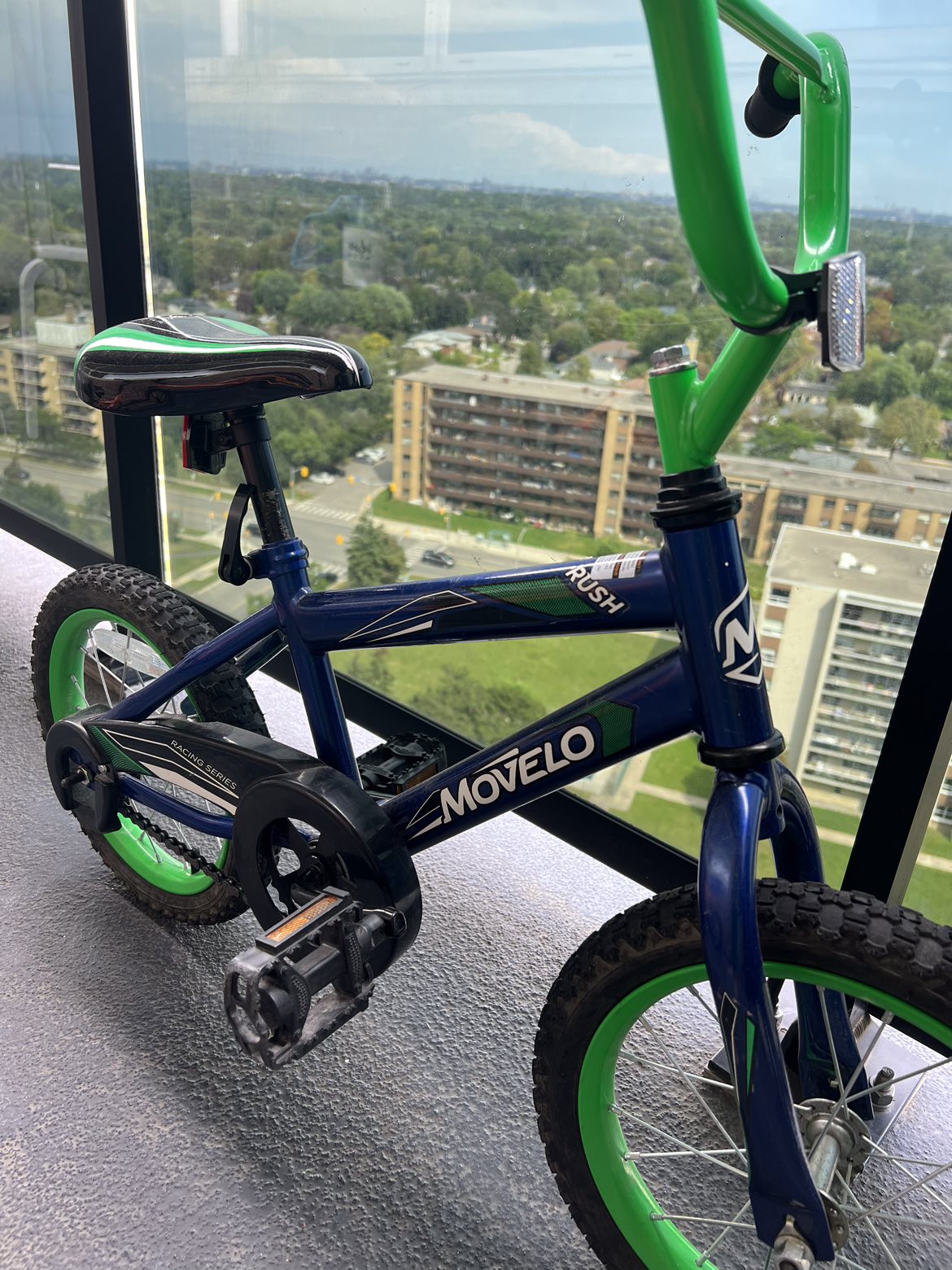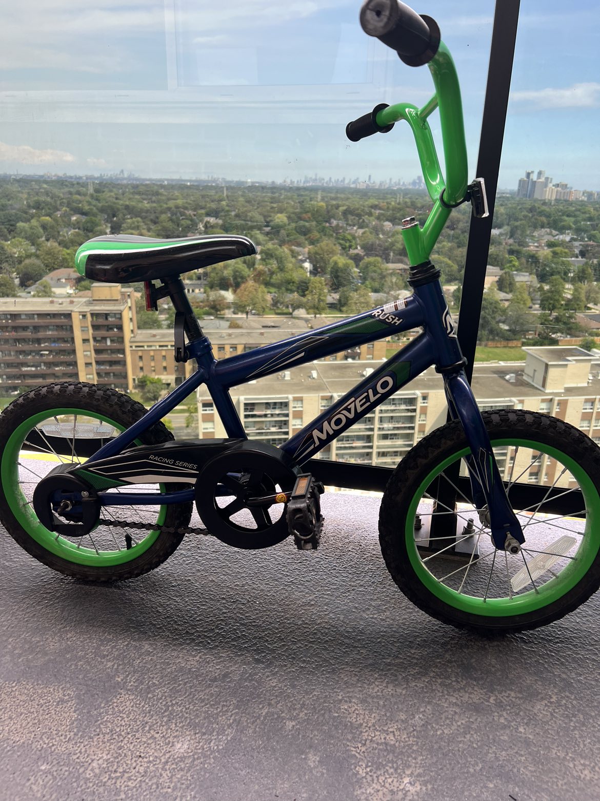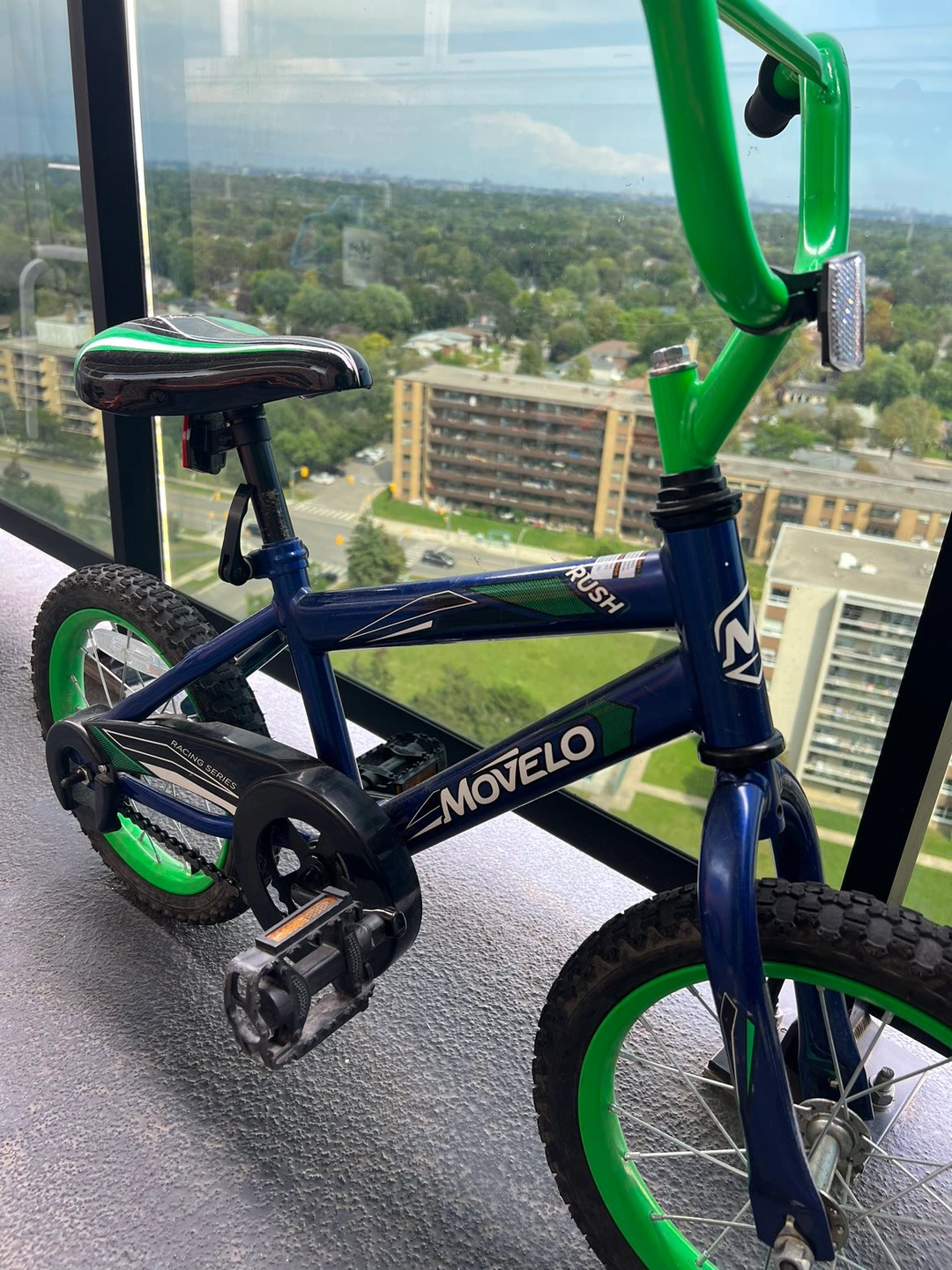Kids bicycle in green. Seat has two scratches as shown. Comes with free support wheels which I removed recently.