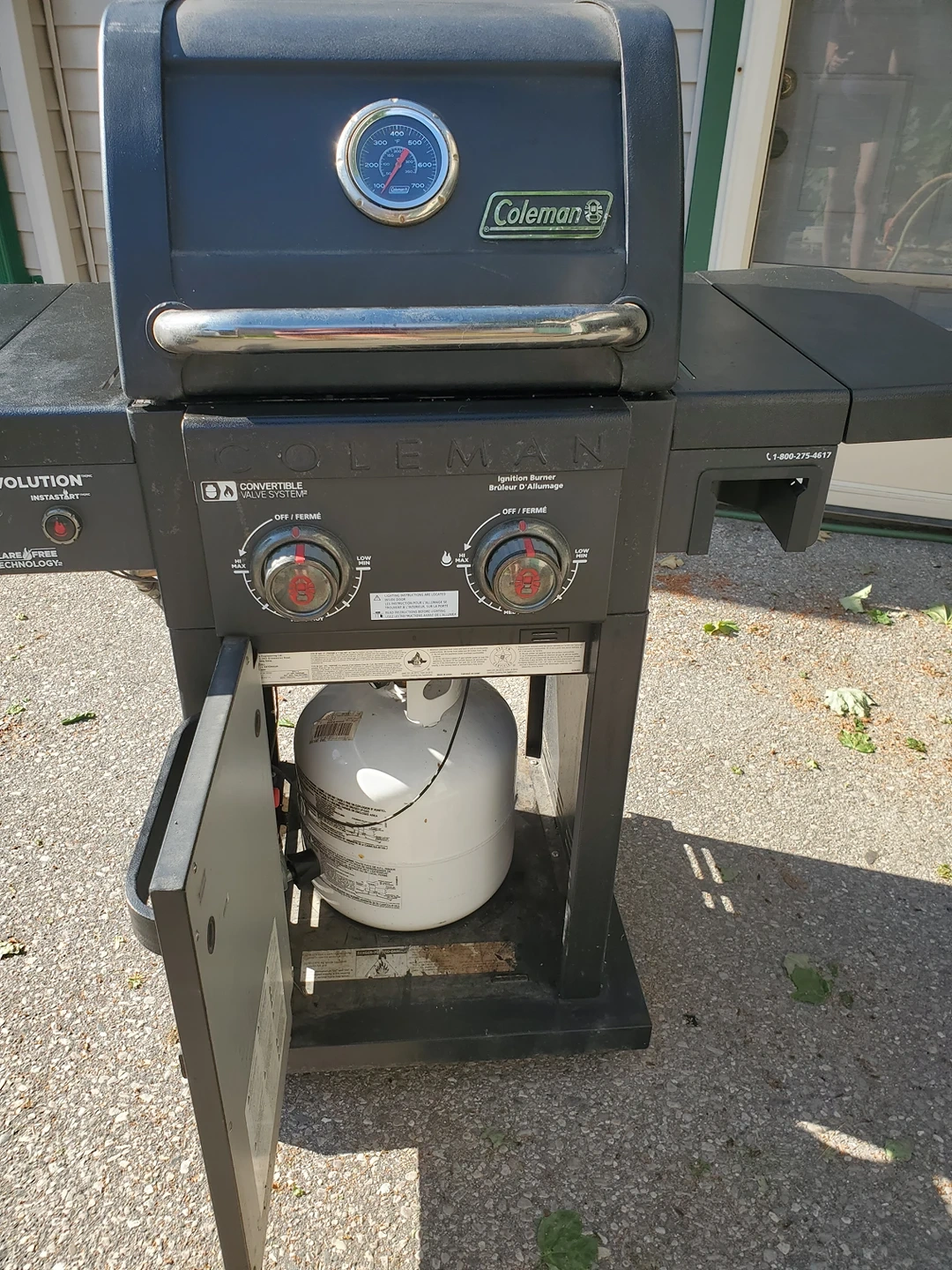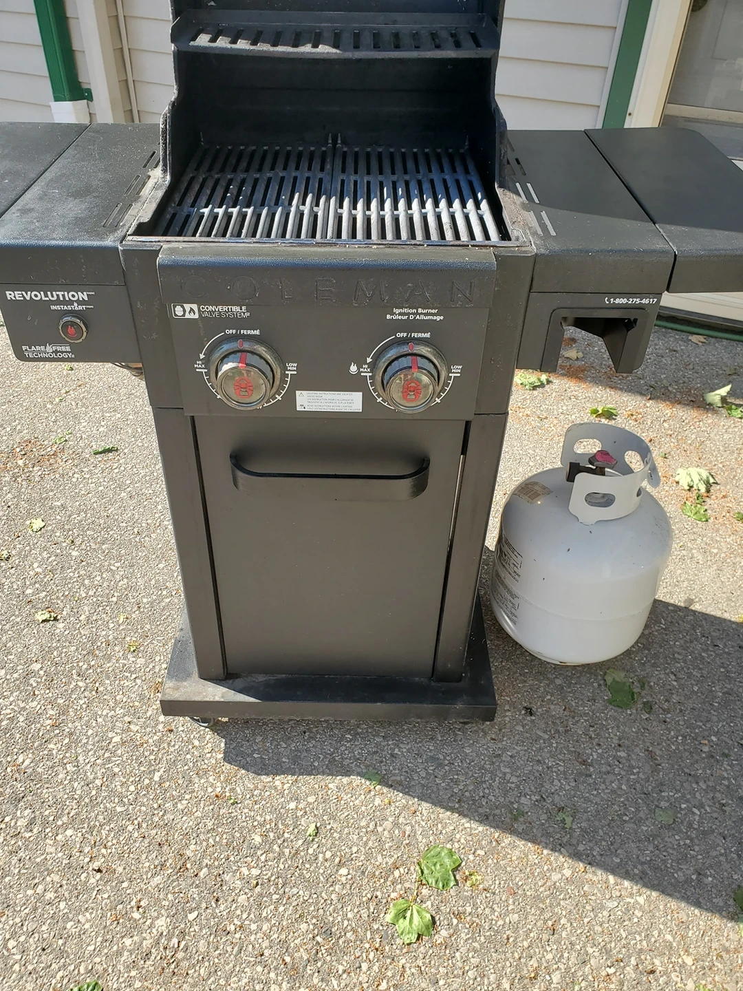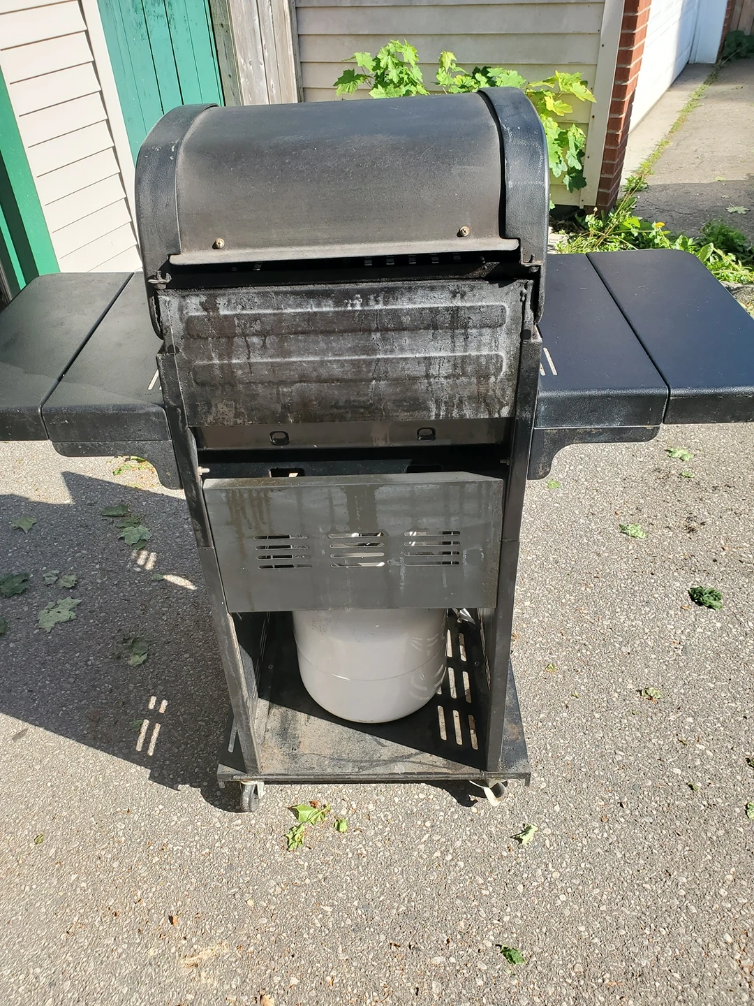 Clean, heavy duty, cast iron lid. comes with all accessories. 4 castors for easy rolling, propane tank only 3 years old. will deliver within area for 10$.
