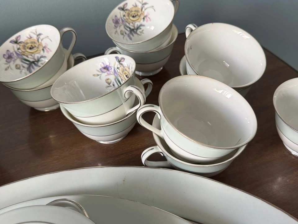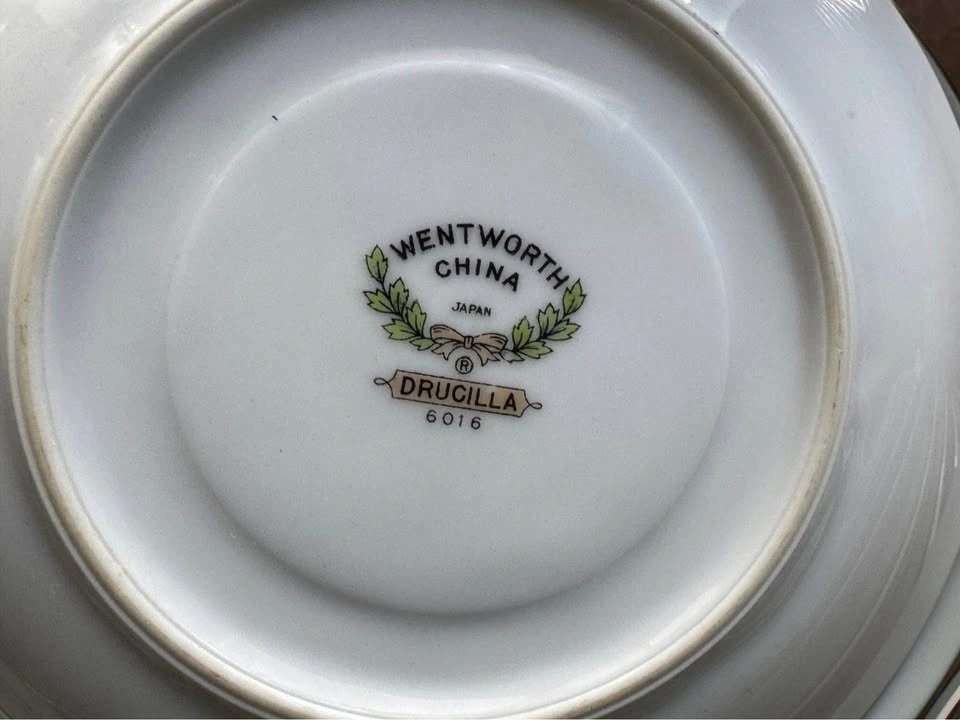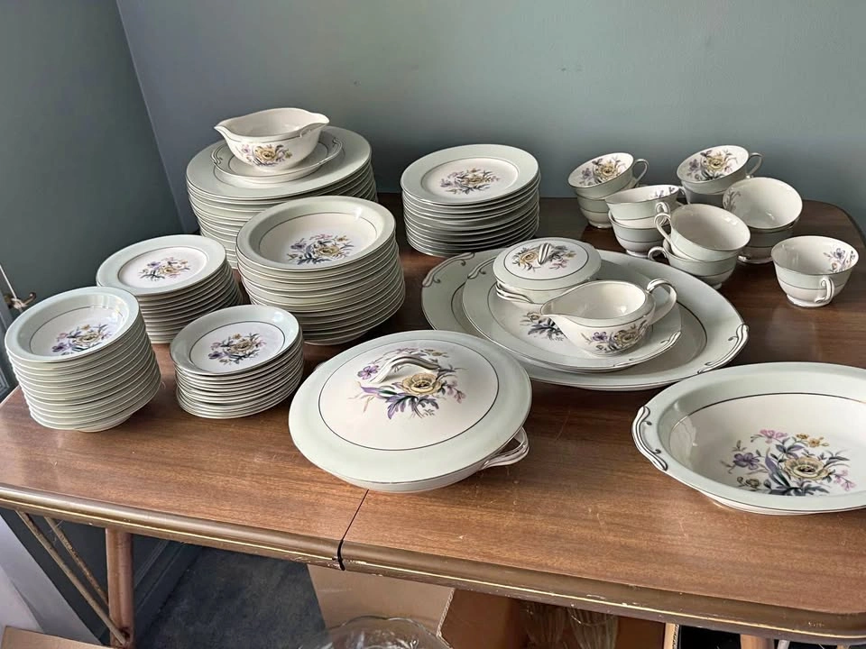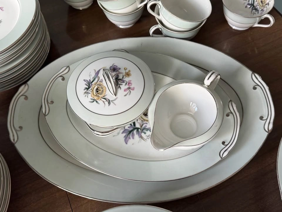77Wentworth China made in Japan DRUCILLA 6016. Total 102 Pieces. 12 piece china set includes: 12 Dinner Plates, 12 Salad Plates (one chipped), 12 Desert Plates, 12 Soup Bowls, 12 Desert Bowls, 12 Saucers, 11 Cups (one missing), 2 Platters, 1 Soup Bowl with lid, 1 Sugar Bowl, 1 Creamer (chipped), 1 Gravy boat, 1 Serving bowl. Any issues with the pieces are shown and last 2 pictures. All other pieces are in like new condition no fading of silver. Pick up in Brighton