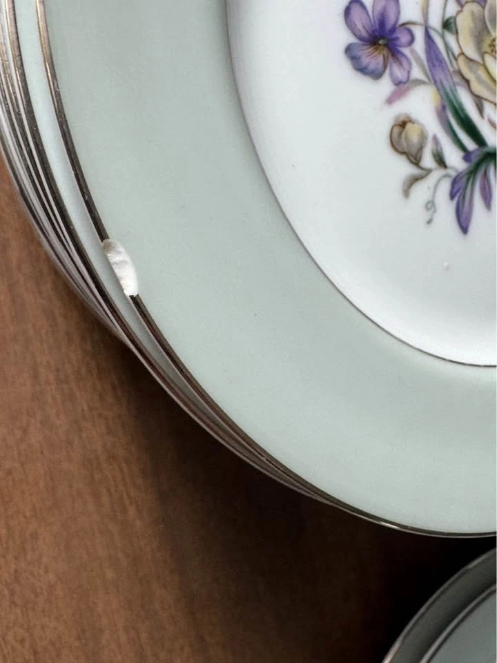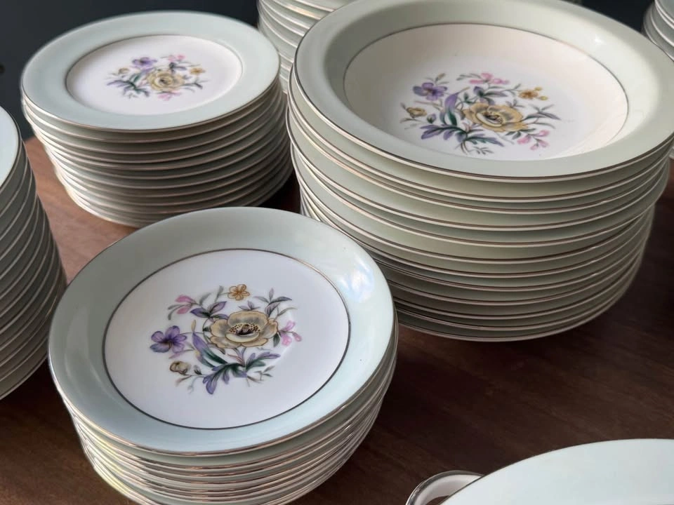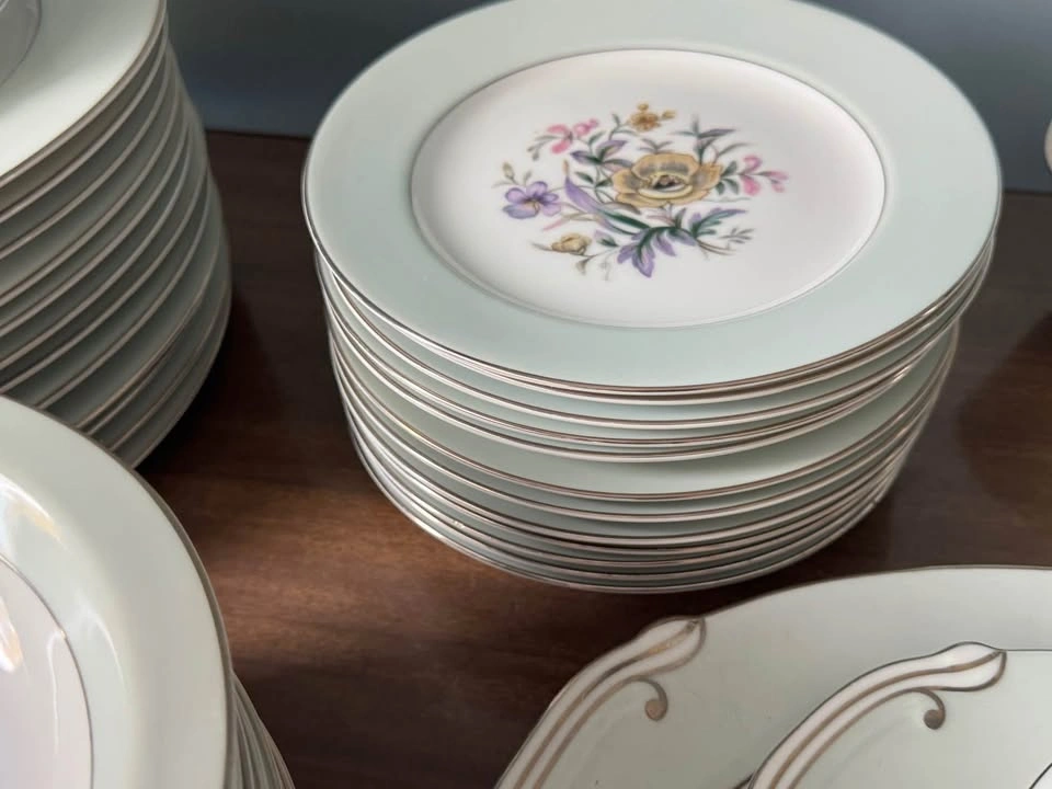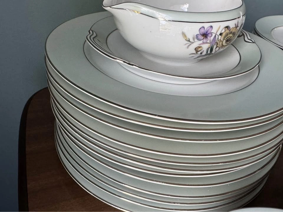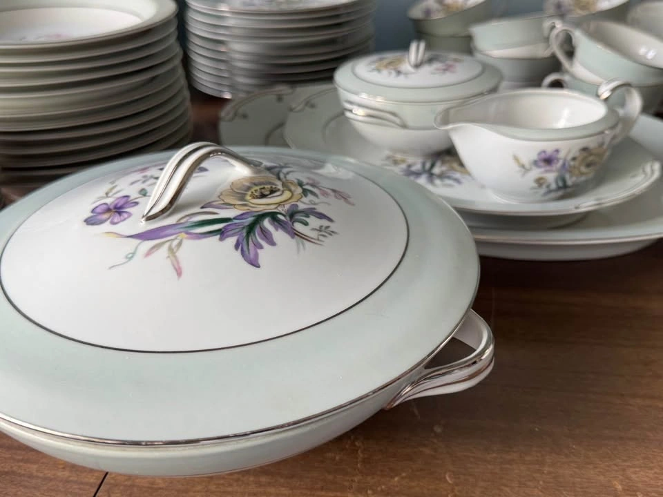 77Wentworth China made in Japan DRUCILLA 6016. Total 102 Pieces. 12 piece china set includes: 12 Dinner Plates, 12 Salad Plates (one chipped), 12 Desert Plates, 12 Soup Bowls, 12 Desert Bowls, 12 Saucers, 11 Cups (one missing), 2 Platters, 1 Soup Bowl with lid, 1 Sugar Bowl, 1 Creamer (chipped), 1 Gravy boat, 1 Serving bowl. Any issues with the pieces are shown and last 2 pictures. All other pieces are in like new condition no fading of silver. Pick up in Brighton