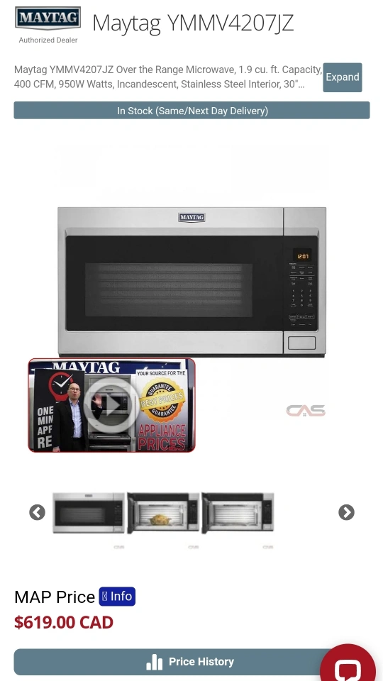 Maytag YMMV4207JZ Over the Range Microwave, 1.9 cu. ft. Capacity, 400 CFM, 950W Watts, Incandescent, Stainless Steel Interior, 30" Exterior Width, Stainless Steel colour