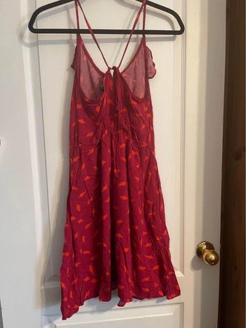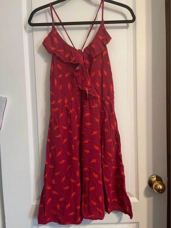 Red with orange bird print, below the knee length