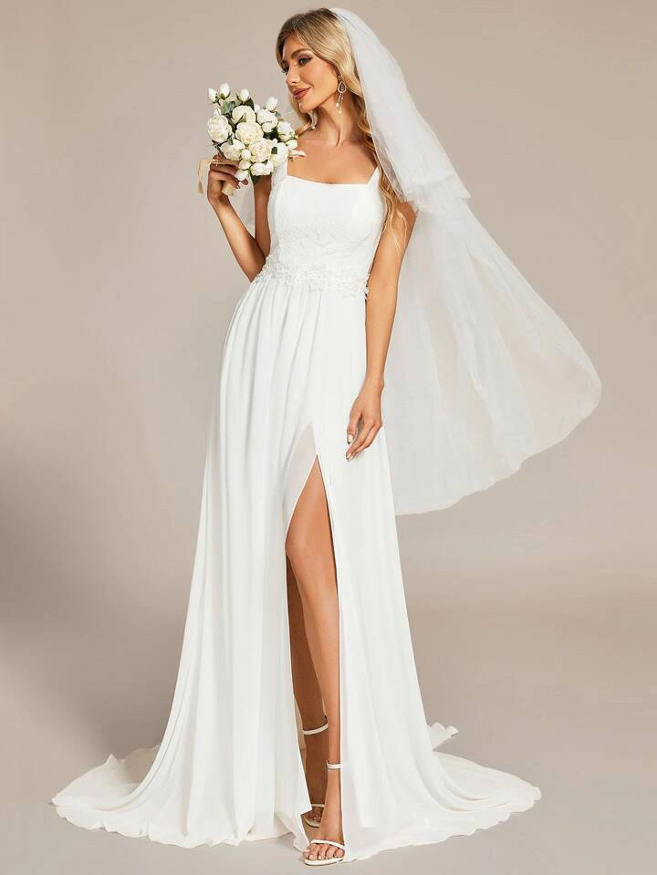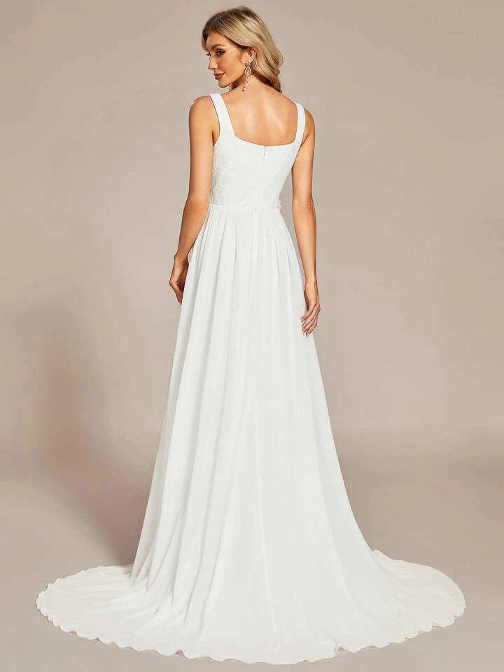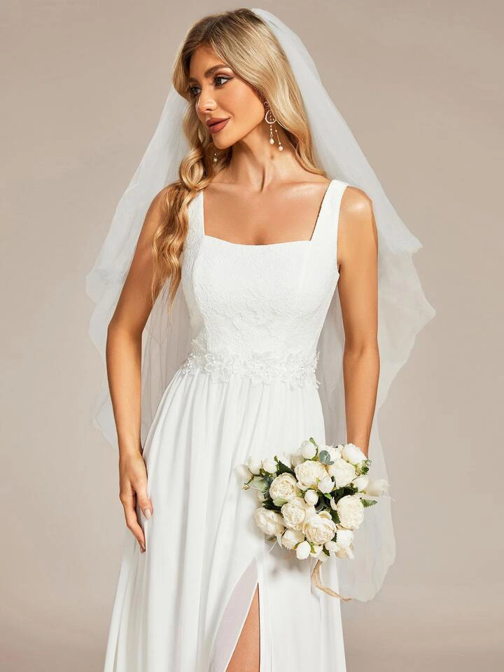 For the radiant bride, this square neckline wedding dress sleeveless is a perfect choice. The intricate lace detailing and elegant design create a stunning and sophisticated look that will make you feel like a queen on your big day. This wedding dress is a classic and timeless choice for any bride. The high slit adds a touch of sensuality, while the delicate lace detailing ensures elegance and sophistication.