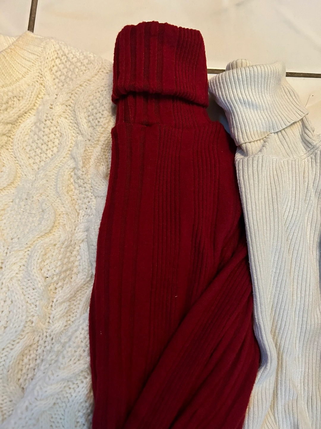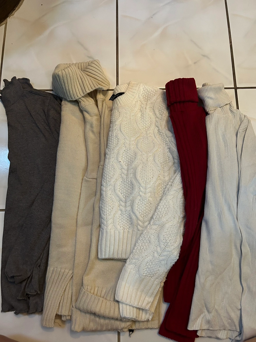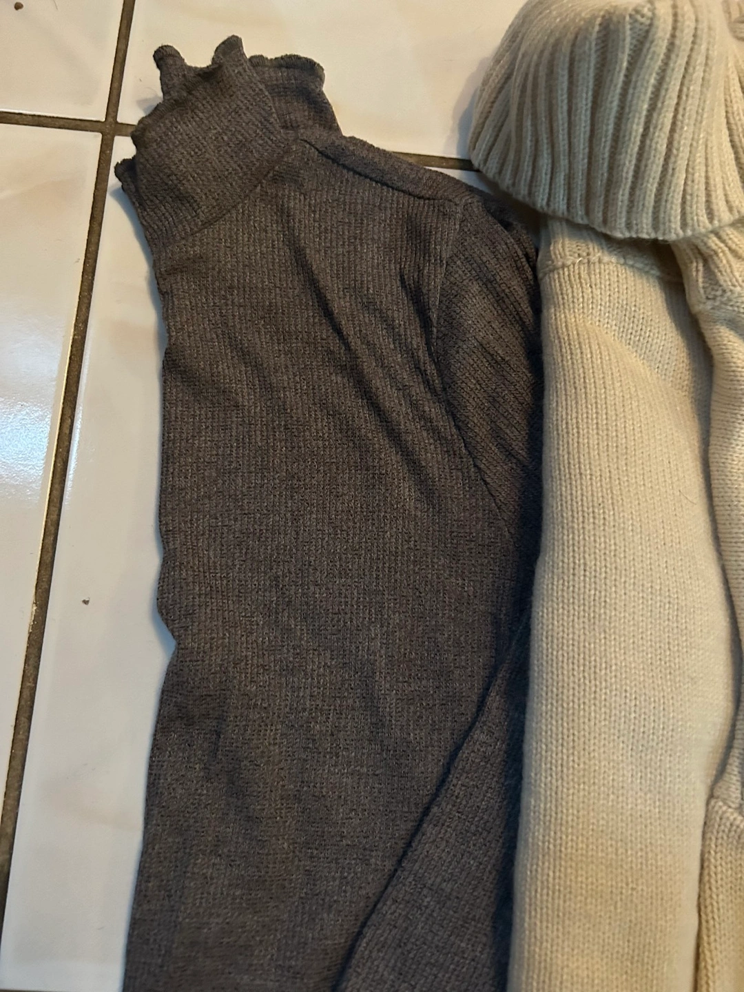 1. Grey turtle neck, thinner/lighter material, soft - size S