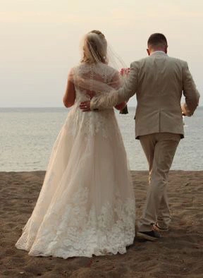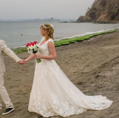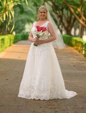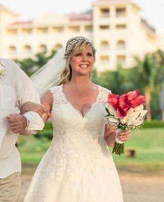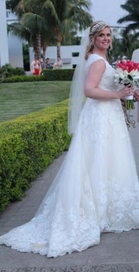 Purchased in 2018 and worn once at our wedding. Professionally cleaned (by David's bridal) and preserved in a box.