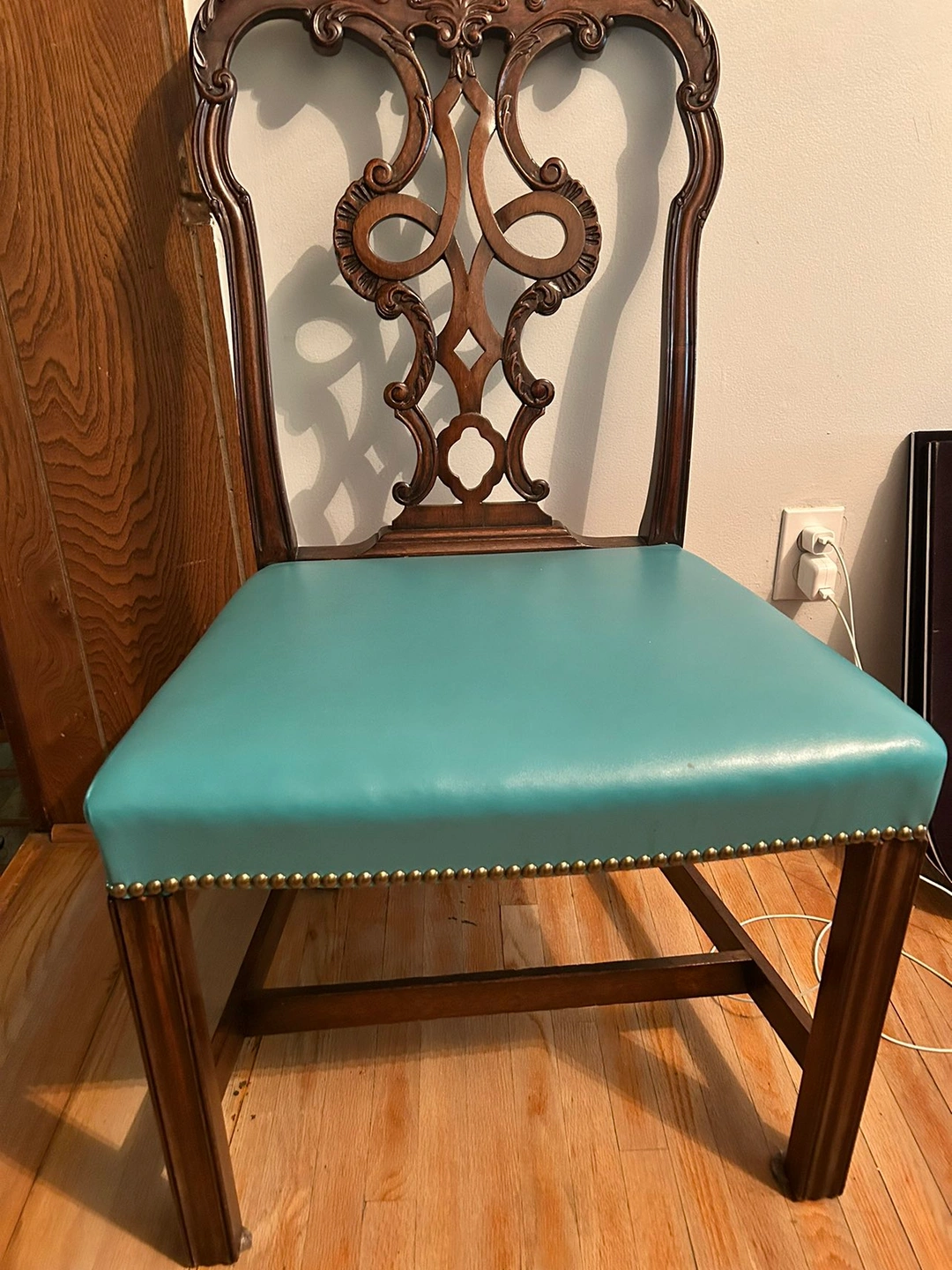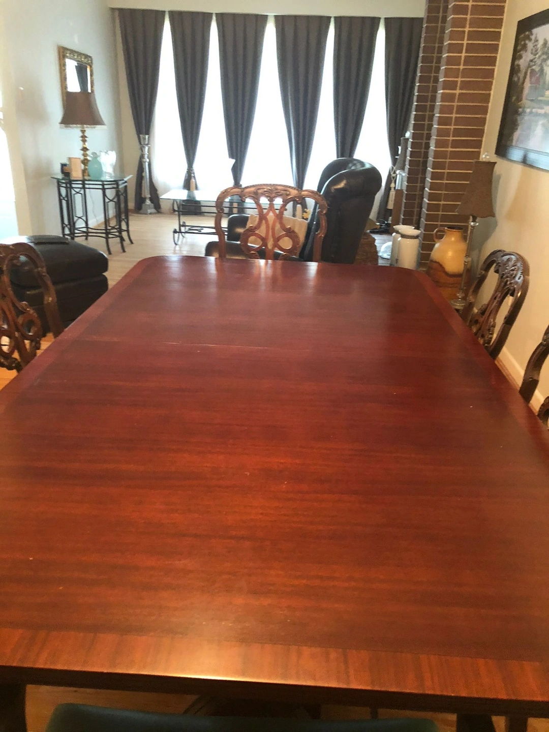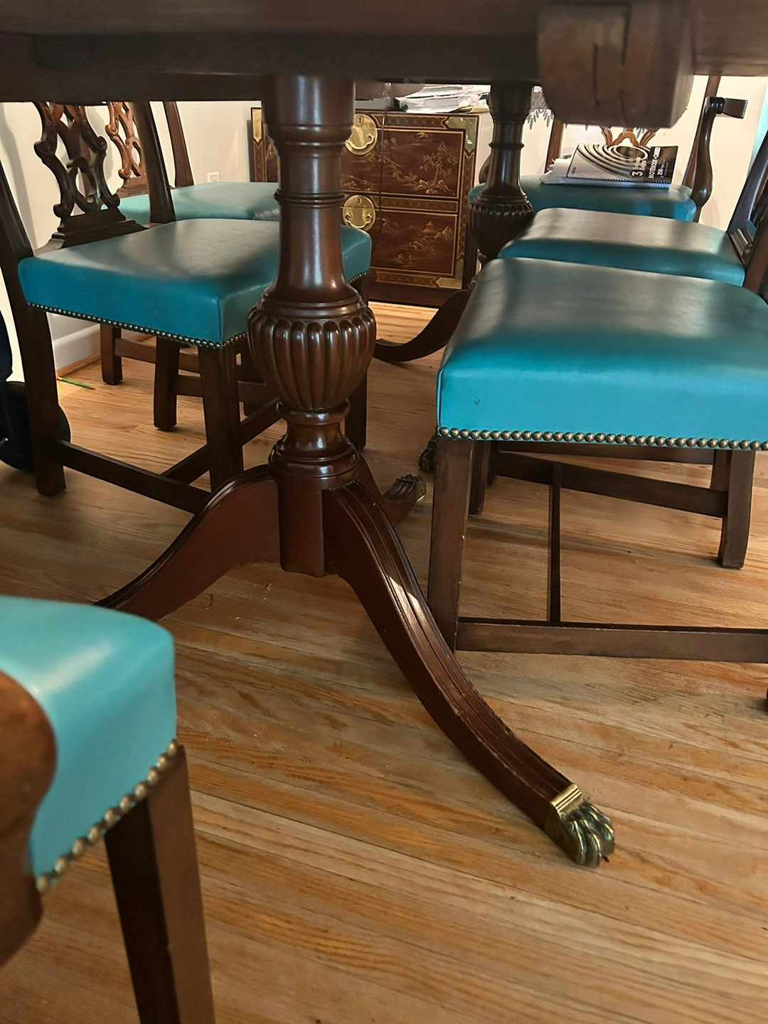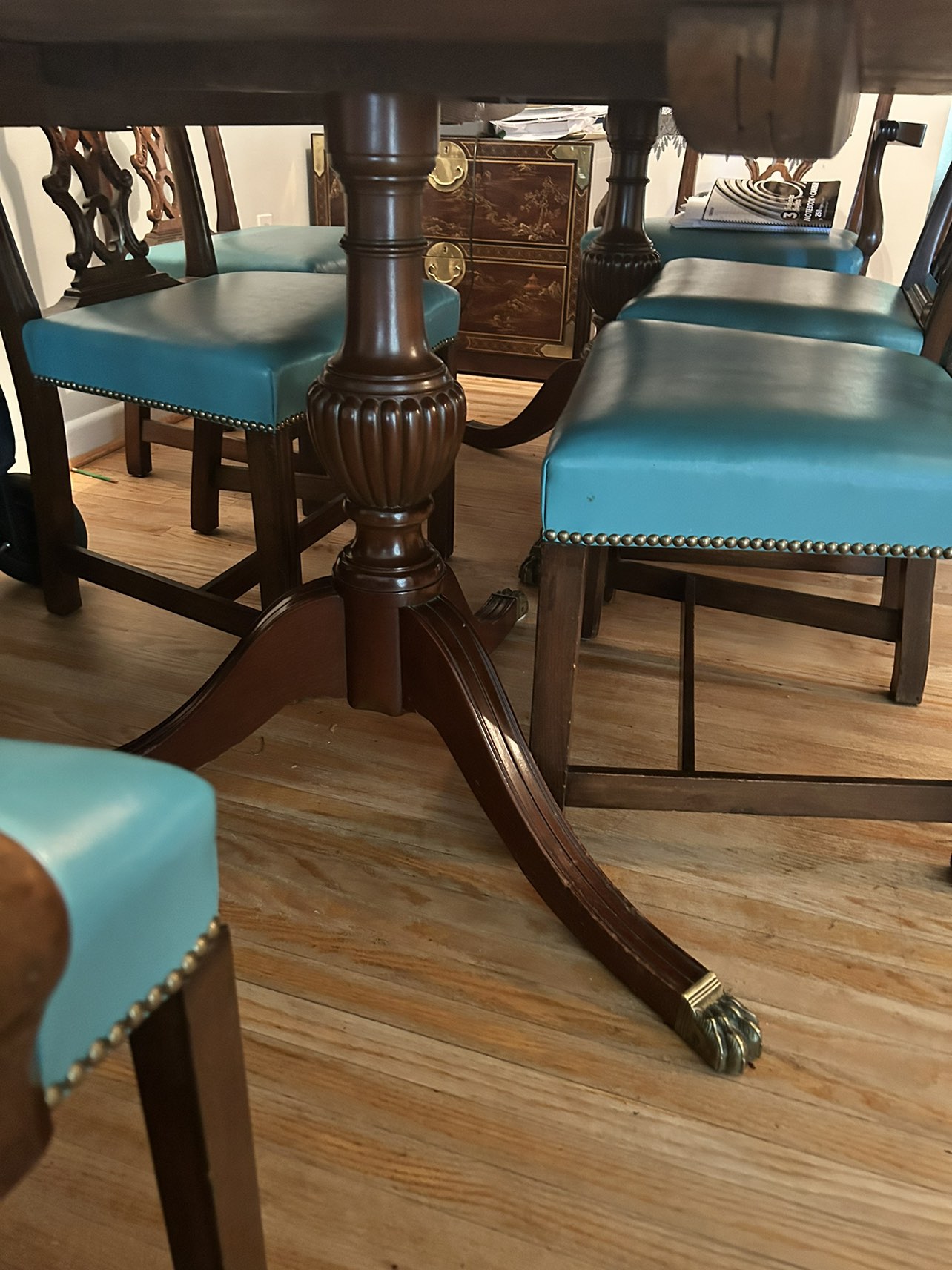 Moving sale. This beautiful set is sold wood with crafted design on the legs of the table and chairs. There is a set of 8 chairs and it’s green leather.
