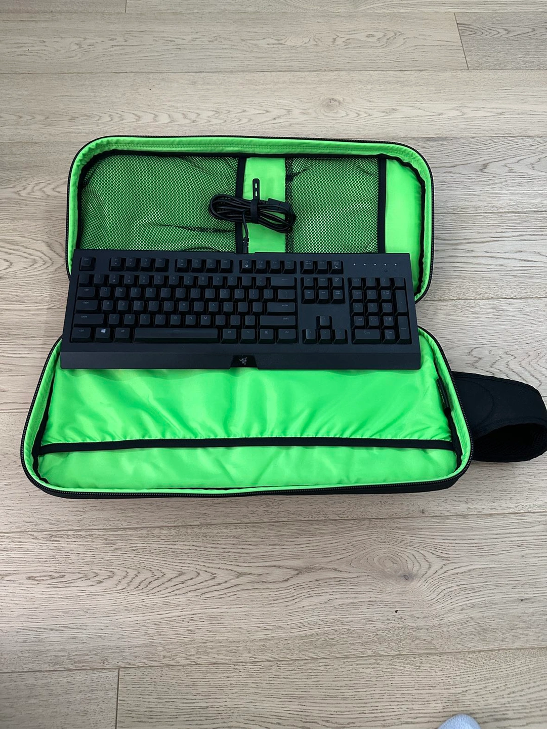 This extremely high quality and durable Razer Keyboard Travel case has served me well in the past and it is time that it goes to a new owner. This extremely nice looking and comfortable keyboard case has lots of pockets and a shoulder strap for easy carrying. With its breathable moisture wicking backing for sweat free carrying it will have you feeling great while toting it around.