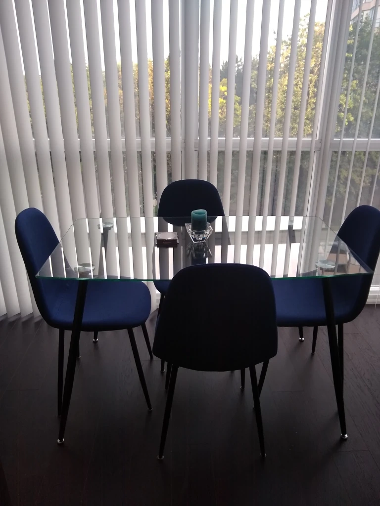 Small glass dining table and 4 upholstered chairs with black metal legs.Great for a small space hardly used about 2 years old,great condition no scratches $300 OBO