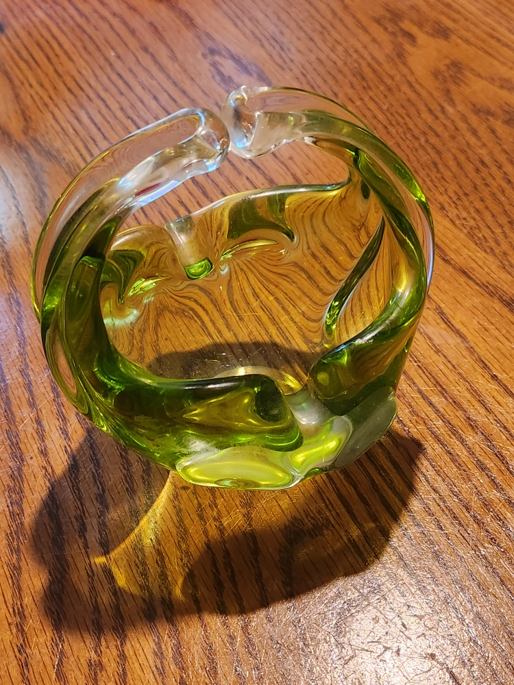 this vintage piece of glass art comes in a bright emerald green colour,perfect vessel to hold small items such as keys or treats
