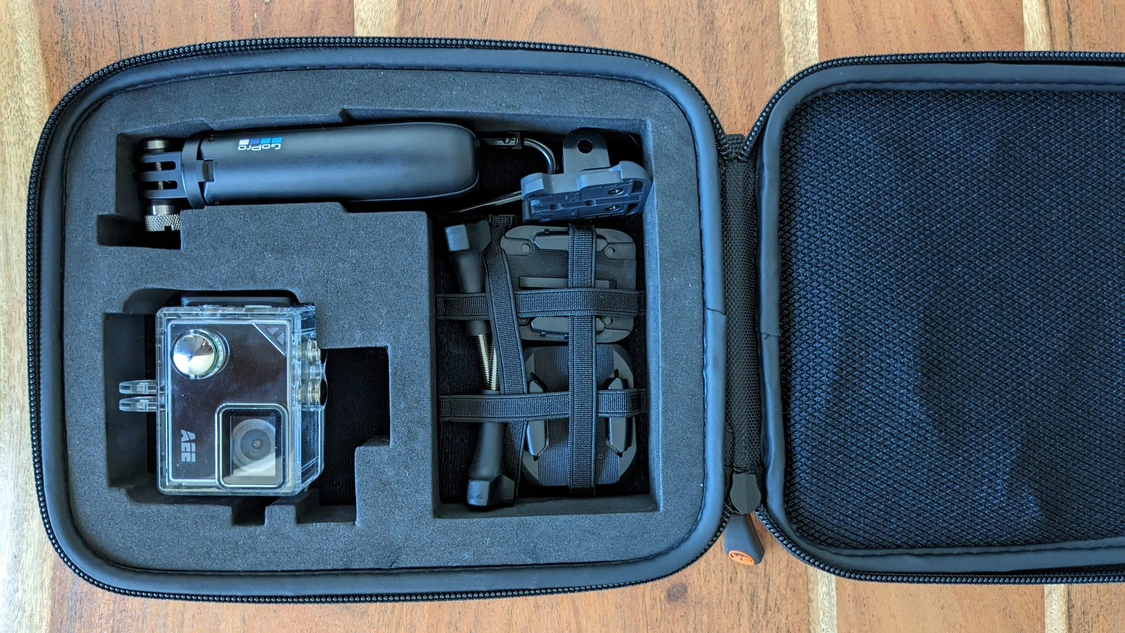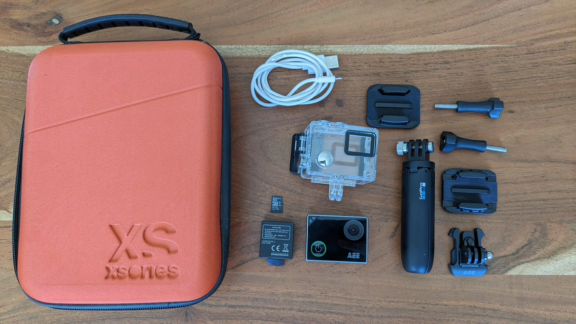 It comes with some accessories (picture 4) charging cable, carrying case, GoPro tripod, and an 8gb micro sd