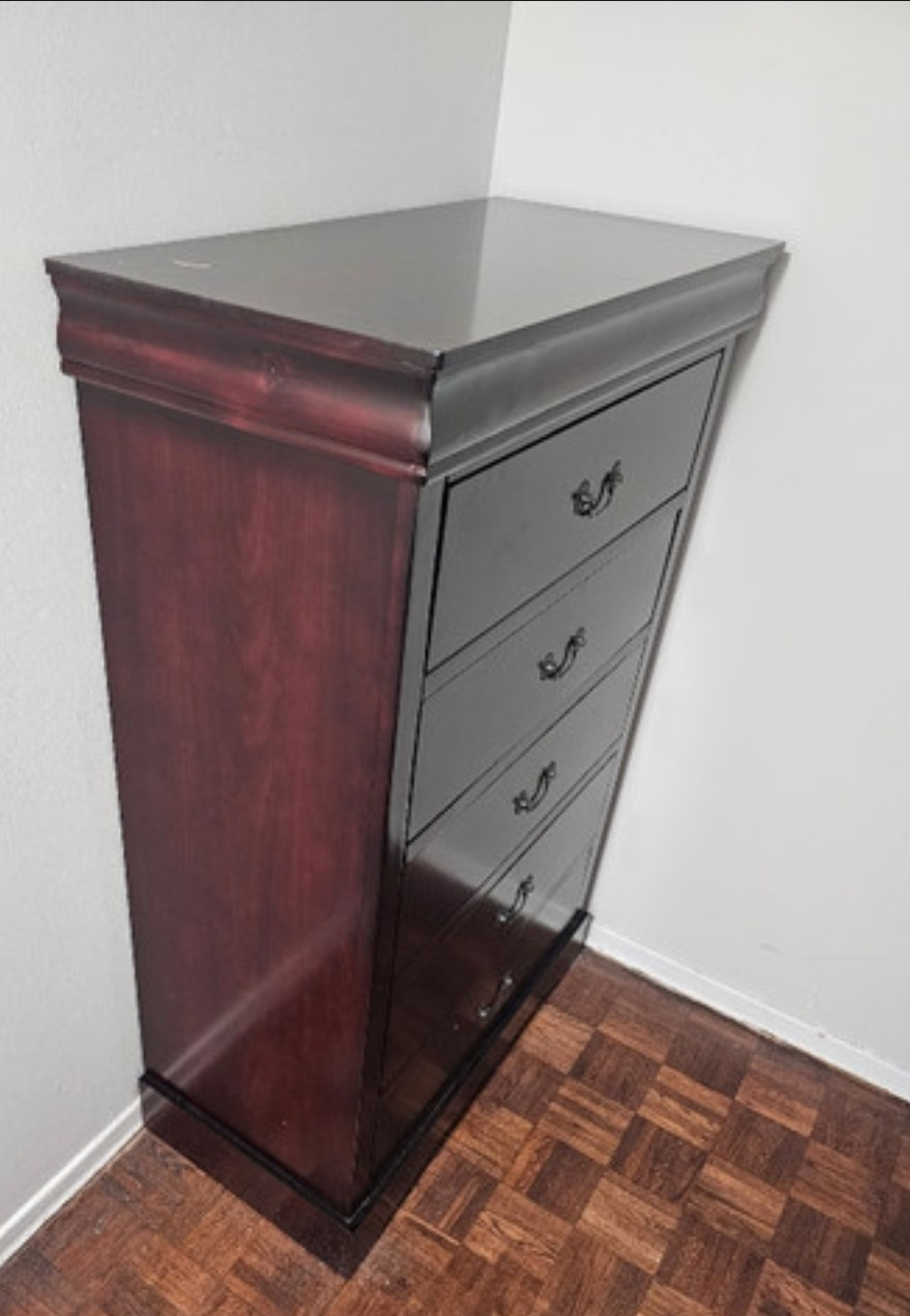 Great condition 5 drawer Chester tall boy. Cherry wood finish.