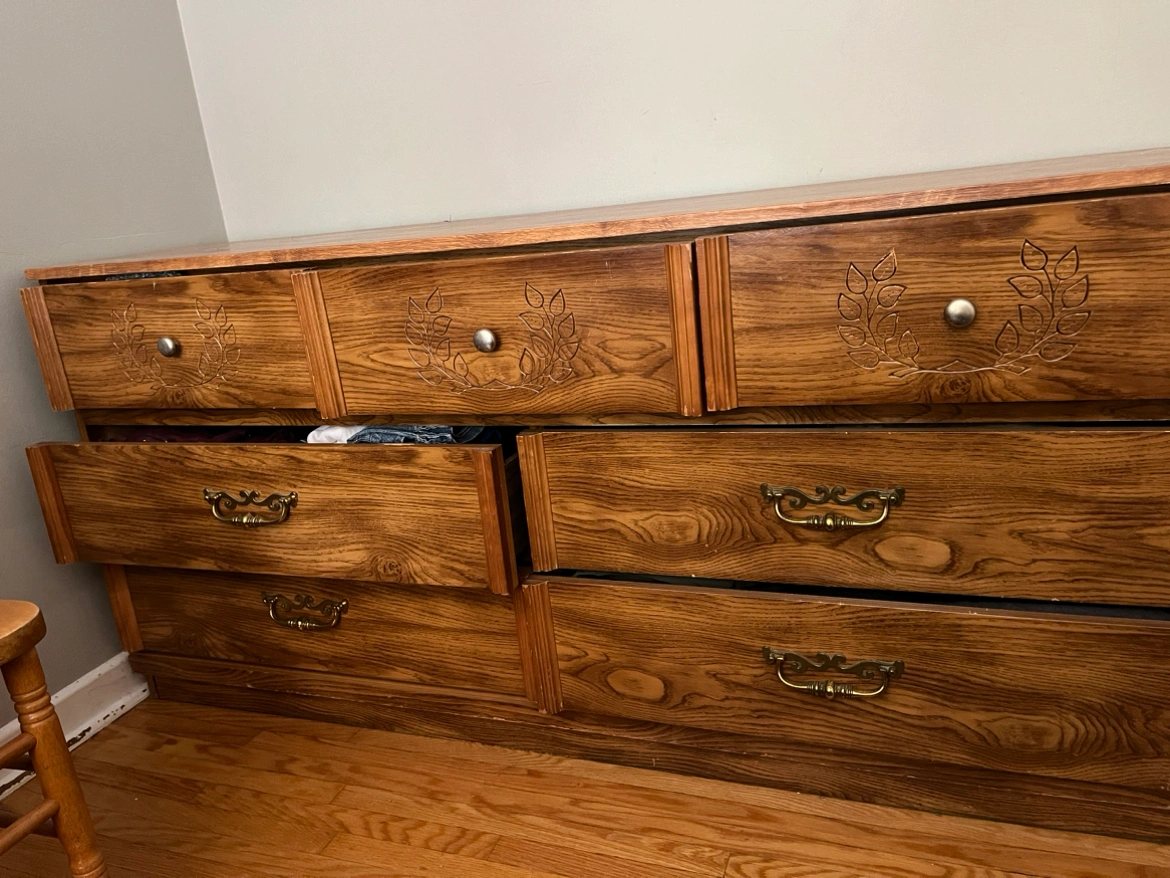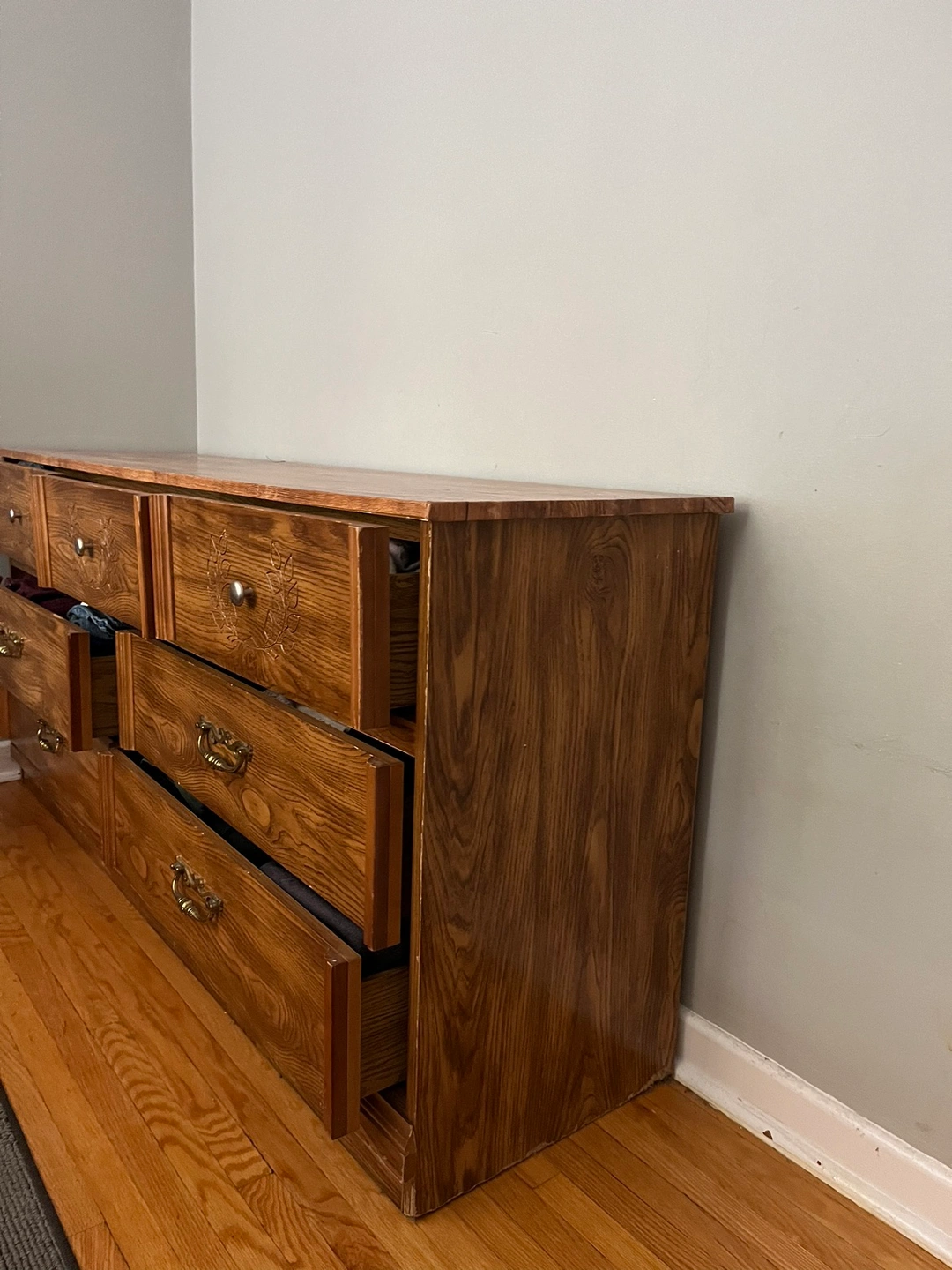 Walnut color, wooden drawers, very clean to keep Keep your clothes and room tidy and well organized.