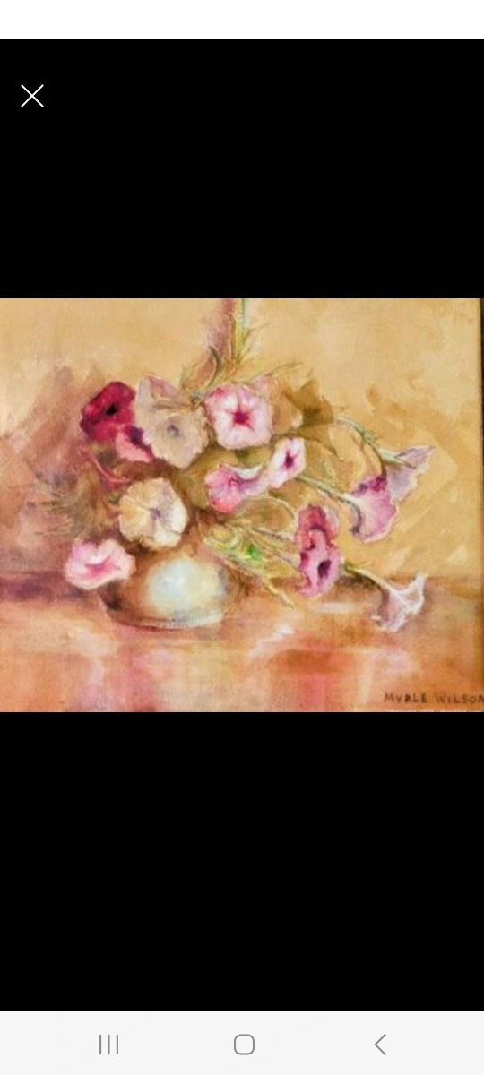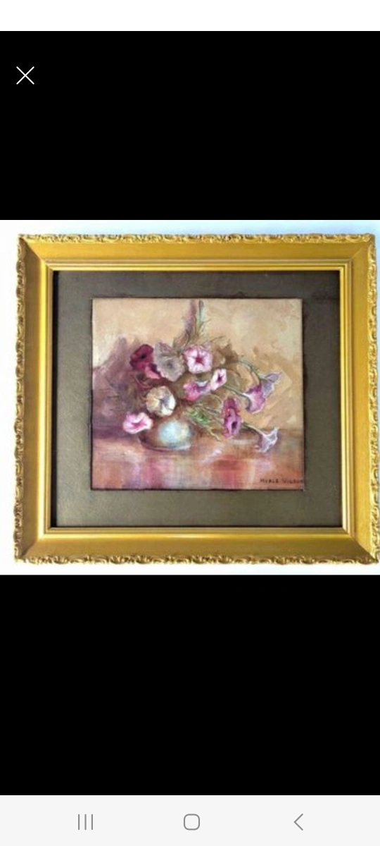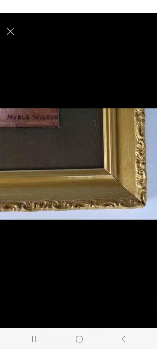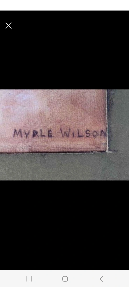 Painting is housed in a beautifully painted ornate frame, signed lower right "Myrle Wilson", matted, and under glass. Lovely soft colours. Wonderful painting.