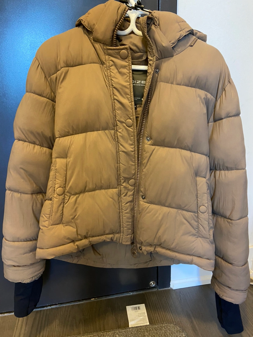 575Gorgeous warm brown late fall/winter jacket! Has two pockets, and has inner sleeves with a hand glove extension that’s soft and comfy and warm. In great condition, worn a handful of times. Difficult to let go of this one, but have to make room in my closet.