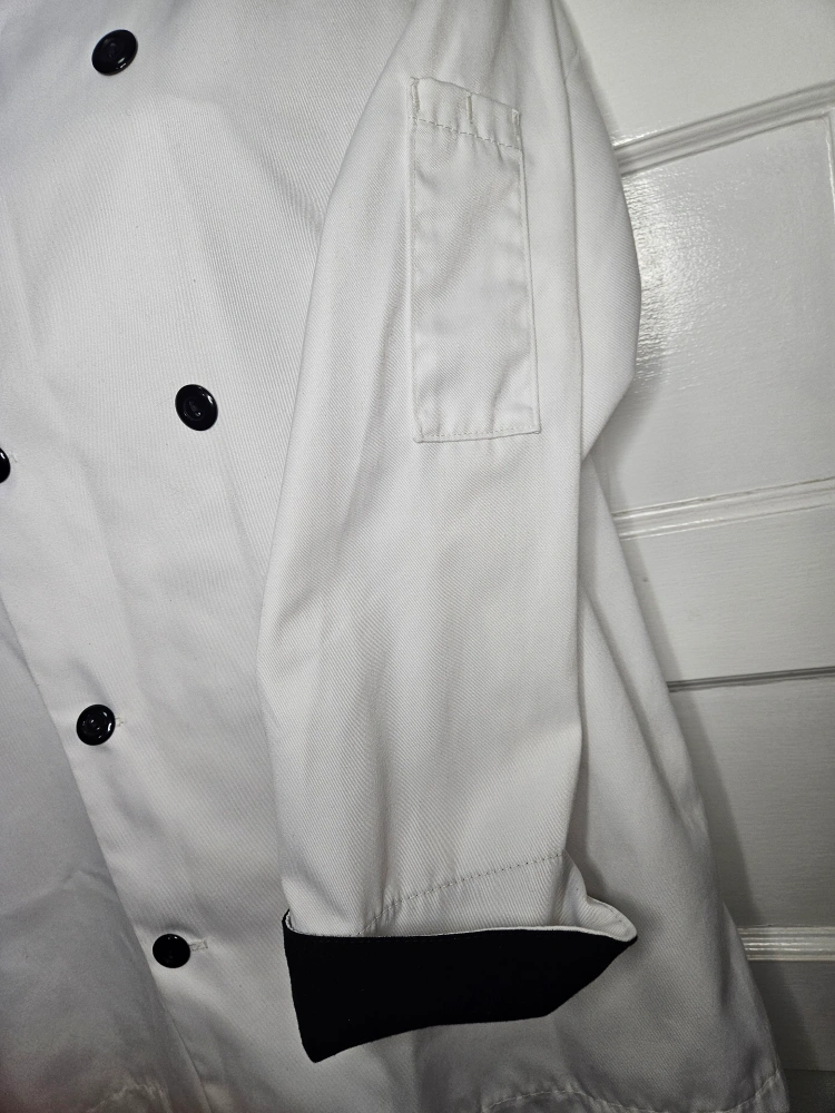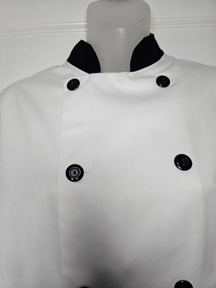 Classic chef coat. Professonial, durable, lightweight, and breathable. Featuring a stand collar. Thermal pen/ pen pocket