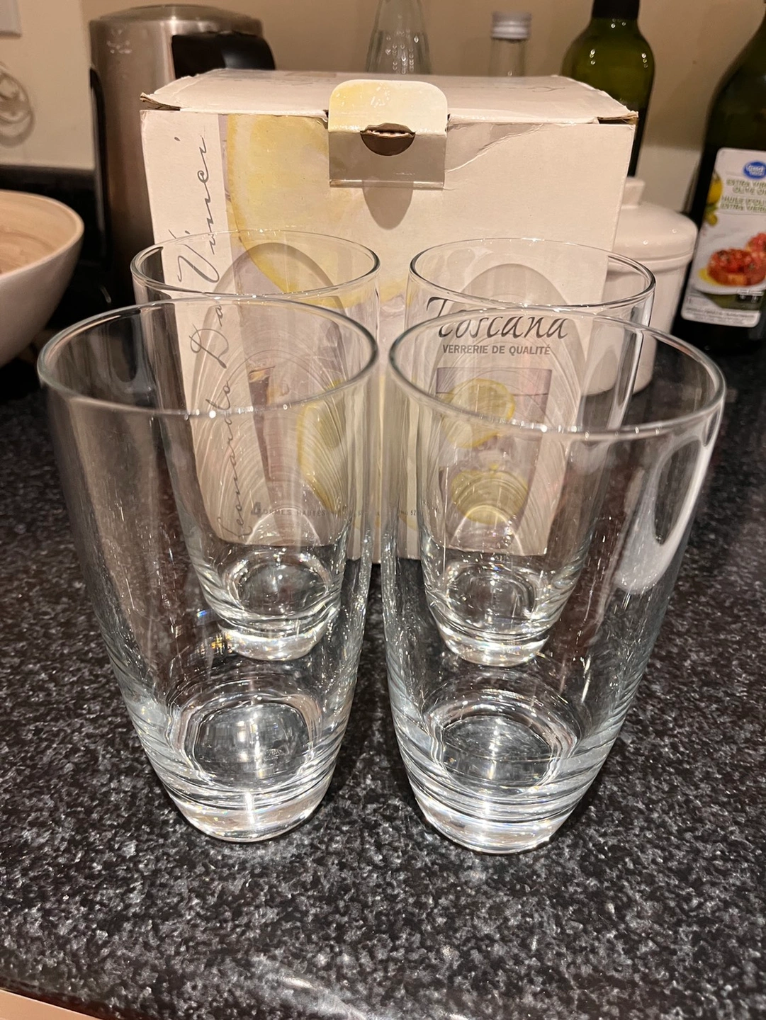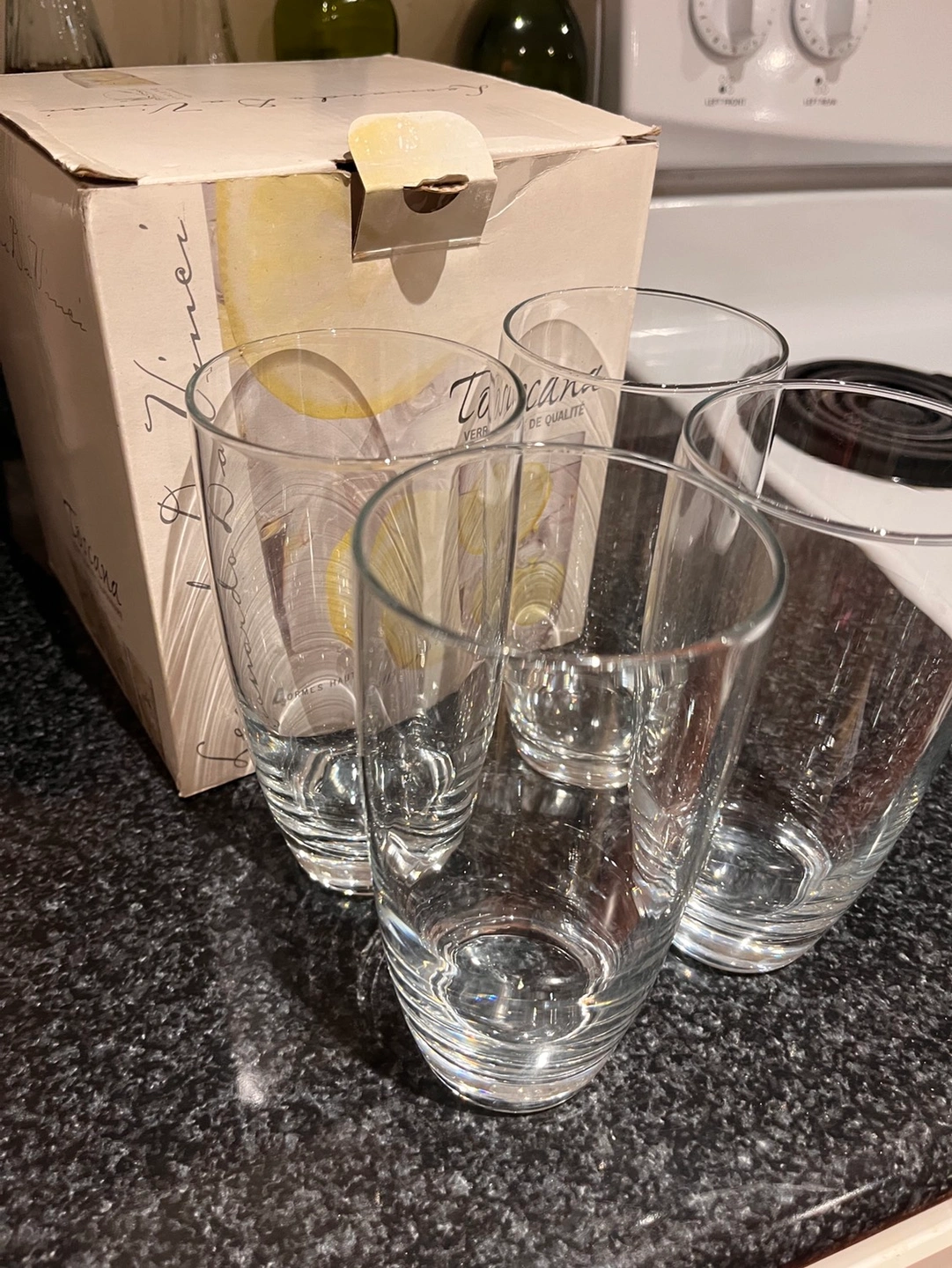Two boxes, 4 glasses in each box. One box is totally new and not touched. The other box used only a few times, just selling because of moving.