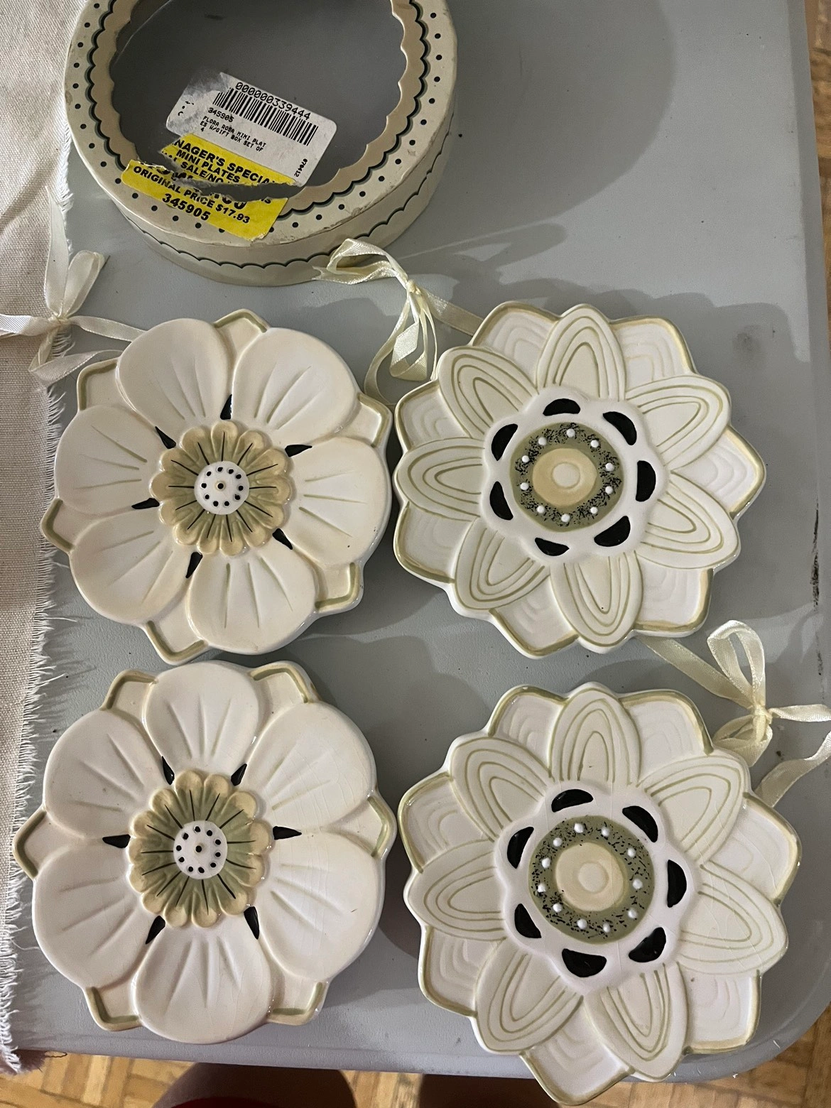 Set of four unique flower plates that can also be hung. Microwave and dishwasher safe. One of them is missing the ribbon to hang on wall but otherwise brand new