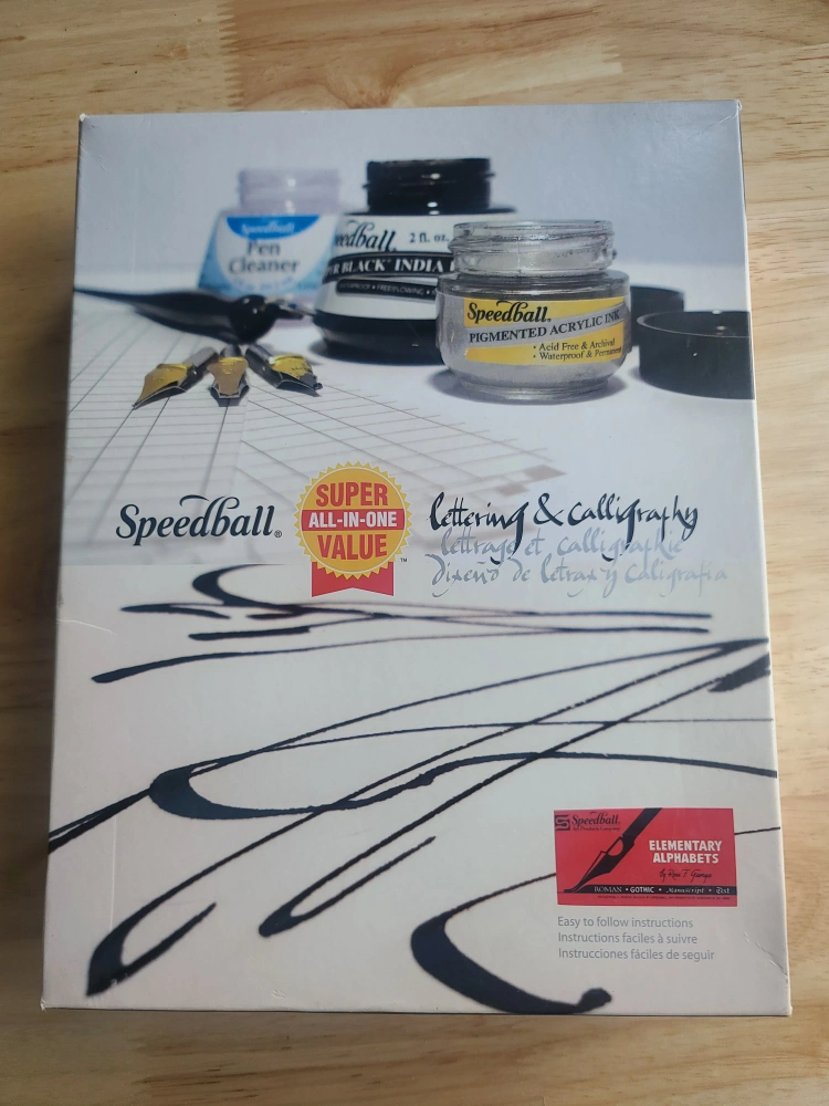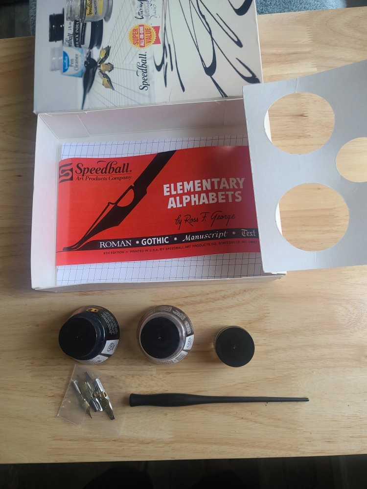 Includes: 2oz (59.1ml) Super Black Indian Ink and Pen Cleaner; .41oz (12ml) Super Pigmented Acrylic Drawing & Lettering Ink (Silver); C1, C2, B4, and A5 Pen Nibs; Speedball Pen Nib Holder; Speedball Elementary Alphabets Instruction Book; practice paper
