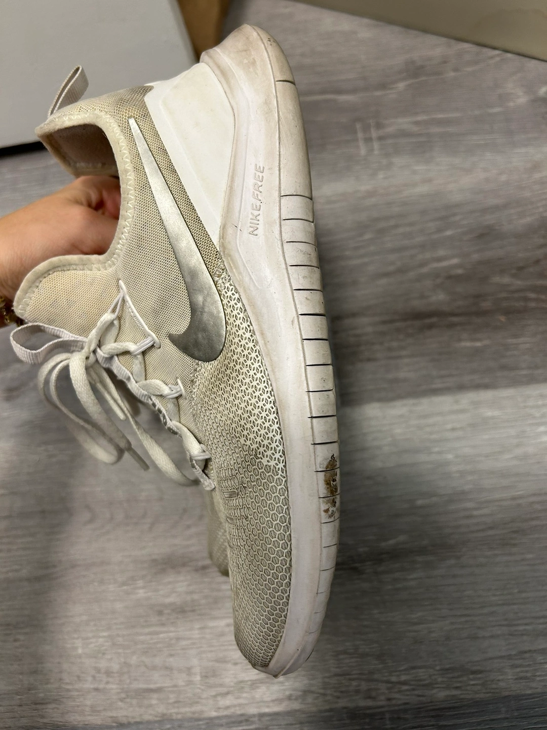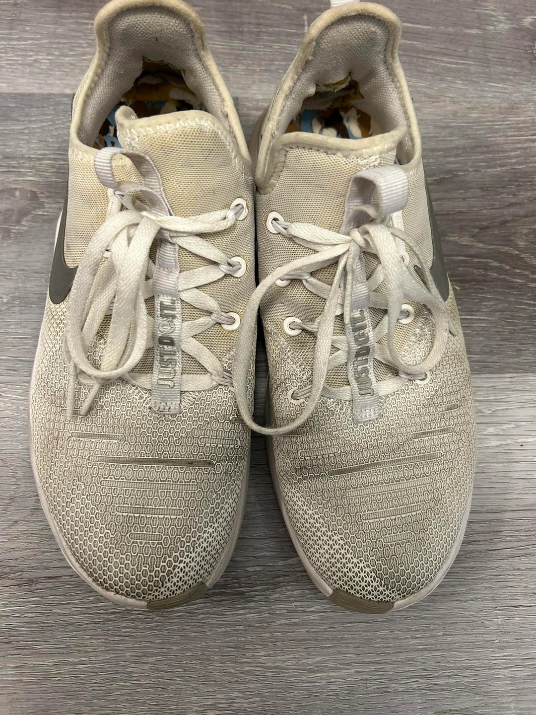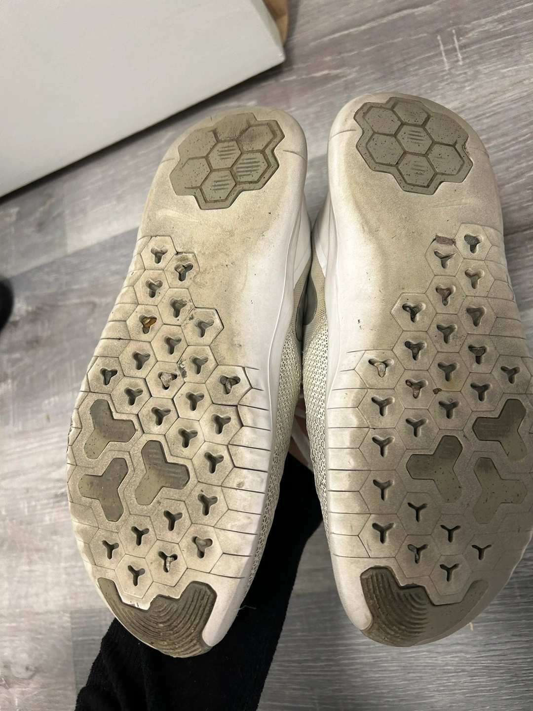 These are white Nike trainers. They served me well and they’re still functional; they just need a good cleaning.