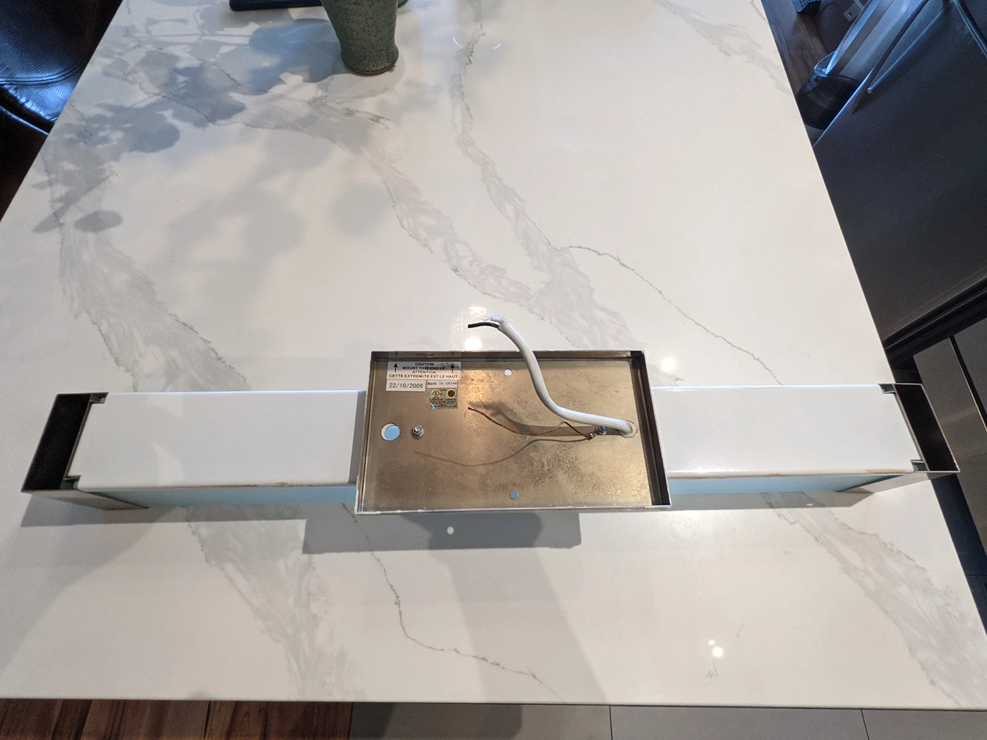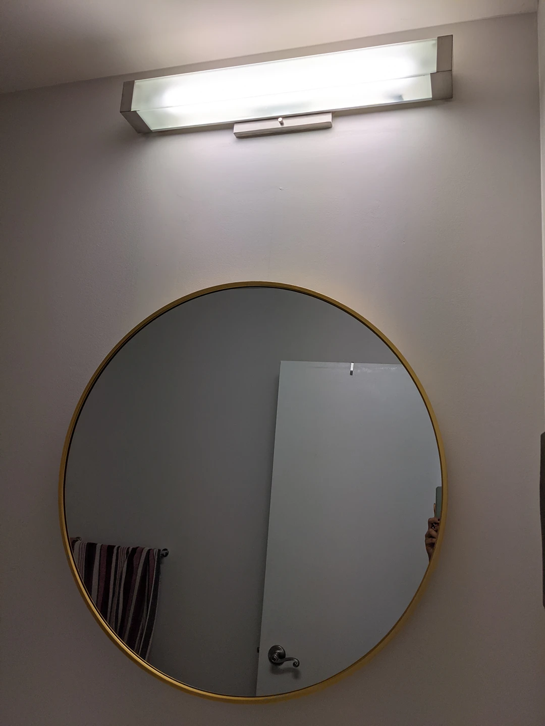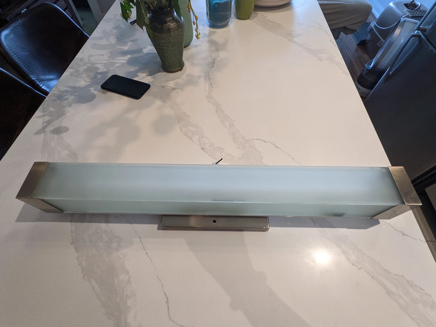 70Rectangular bathroom light fixture. Light: 65 cm x 7 cm Box: 11.5 cm x 8 cm Works perfectly, so would love if someone can put it to good use.