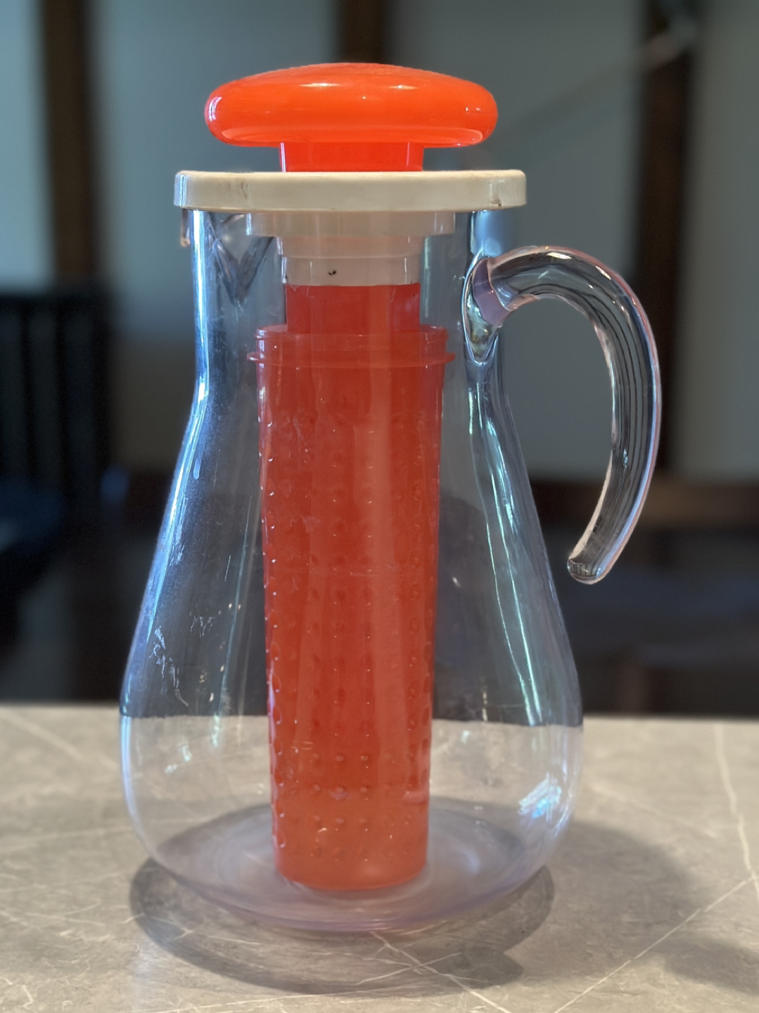Orange acrylic beverage pitcher with central ice chamber to keep beverages cold and not watered down. Also comes with a central fruit or tea diffuser sleeve. Free! #freecycle